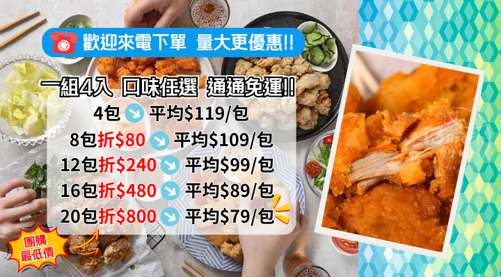 產品成份:雞腿肉、酥炸粉{樹薯澱粉、玉米粉、麵粉、麵包屑〔麵粉﹝小麥麵粉、維生素C(抗氧化劑)、澱粉水解酵素(含樹薯澱粉、糊精)、聚木醣酵素(含樹薯澱粉、麵粉)、磷脂酵素(含樹薯澱粉、麵粉)﹞、鹽、糖、酵母〕、玉米澱粉、食鹽、酸性焦磷酸鈉、蛋白粉、大豆油、碳酸氫鈉、胡椒、玉米糖膠、紅椒色素}、水、調味料(鹽、L-麩酸鈉、酵母抽出物、大蒜粉、麥芽糊精、大蒜萃取物、二氧化矽、大豆油)、磷酸二澱粉、品質改良劑(多磷酸鈉、焦磷酸鈉、偏磷酸鉀)、香料、甜味劑(D-山梨醇、蔗糖素)