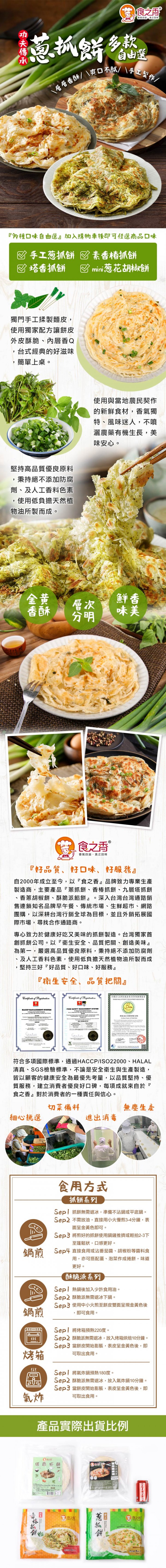 食用方式:本產品不必解凍。將平底鍋熱鍋後,加入少許的油,將抓餅放入鍋中煎至兩面呈金黃色即可食用。