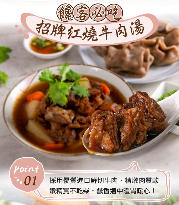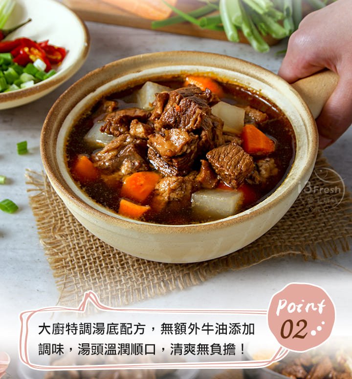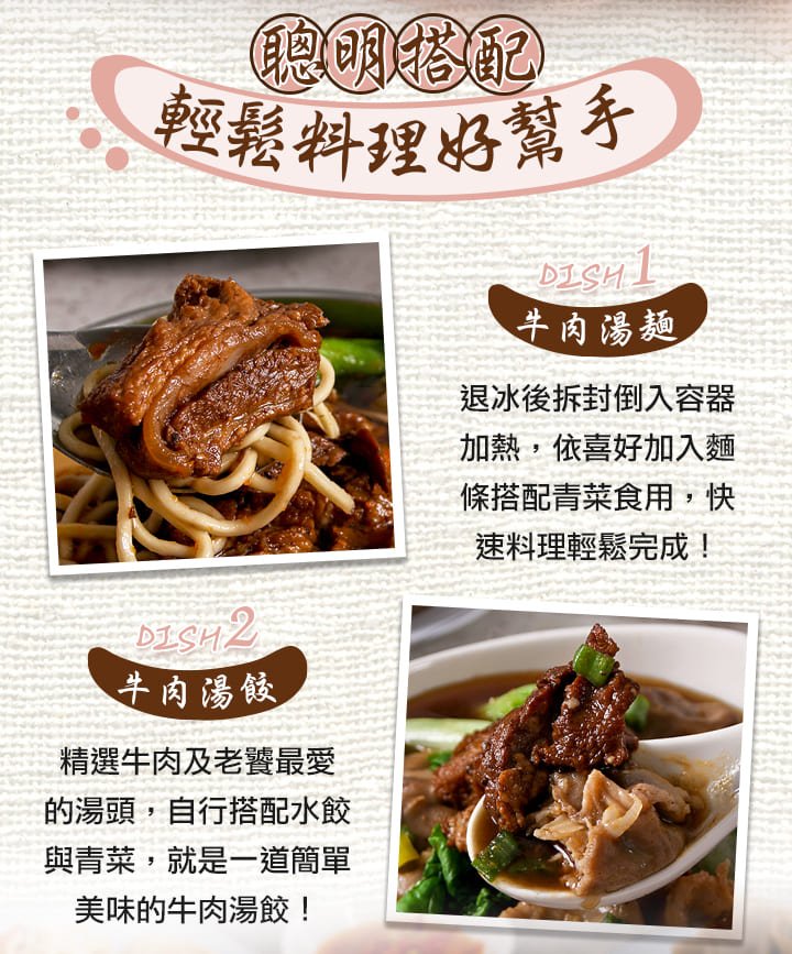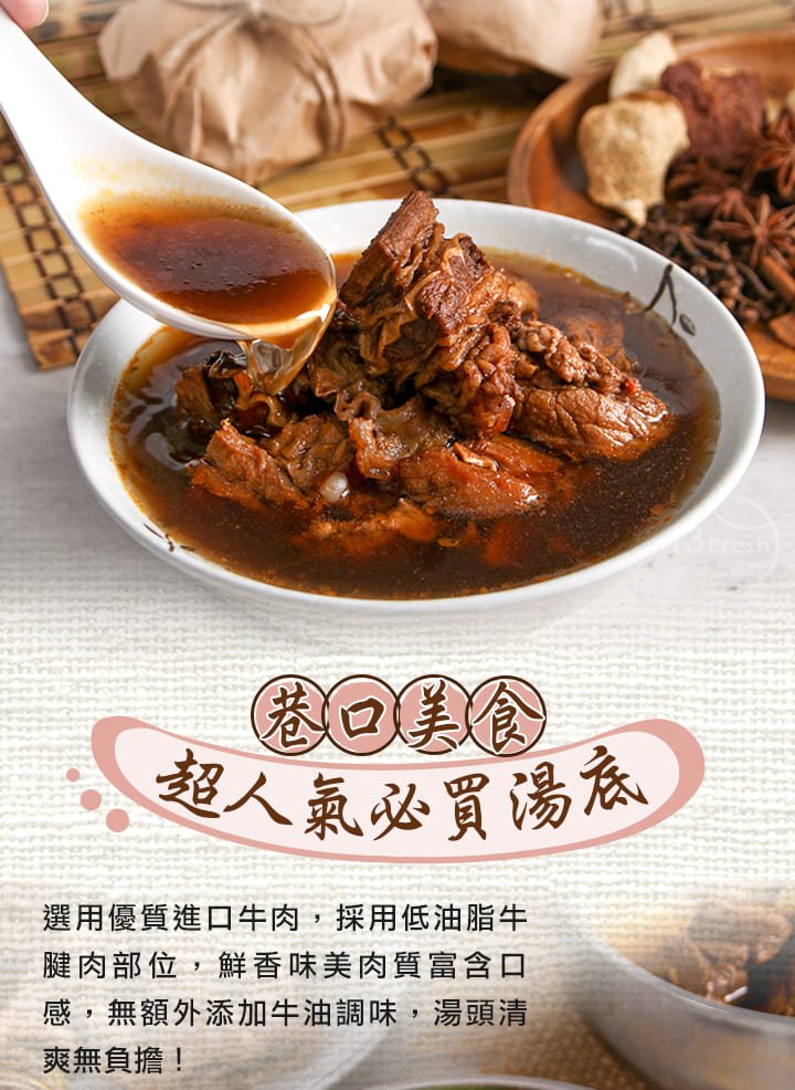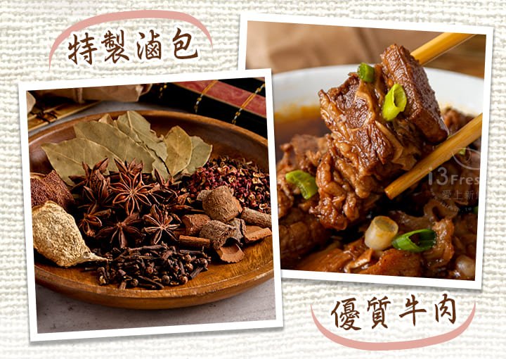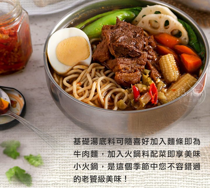 產品成份:水、牛肉、食鹽、糖、L-麩酸鈉(調味劑)、辣豆瓣醬[黃豆(基因改造)、食鹽、大豆油、芝麻油、乙醯化己二酸二澱粉、醋磺內酯鉀(甜味劑)、甘胺酸、5’-鳥嘌呤核苷磷酸二鈉、5’-次黃嘌呤核苷磷酸二鈉、甘草素(甜味劑)、麥芽糊精、肉桂粉、蔗糖素(甜味劑)、琥珀酸二鈉、苯甲酸(防腐劑)]、紅蔥醬{非基改芥花油、紅蔥頭、非基改純釀造黃豆醬油、非基改大豆蛋白、肉精香料[香料(糊精、中鏈三酸甘油酯、辛烯基丁二酸鈉澱粉、香料、丙二醇、甘油、L-麩酸鈉、焦糖色素、5’-鳥嘌呤核苷磷酸二鈉、5’-次黃嘌呤核苷磷酸二鈉)、麥芽糊精、水、黃豆水解蛋白、醬油、酵母抽出物、胡椒抽出物、鹽、茴香抽出物]、食鹽、蔗糖、辣椒醬(辣椒、水、食鹽)、百草粉(麥芽糊精、眾香子、茴香抽出物、小麥纖維、丁香抽出物、肉桂抽出物)、酵母抽出物、5’-鳥嘌呤核苷磷酸二鈉、5’-次黃嘌呤核苷磷酸二鈉、胡椒}、牛肉滷包(小茴、肉桂、八角、胡荽、花椒、月桂葉、陳皮、丁香)、米酒、白胡椒、辣椒粉、焦糖色素、調味劑(DL-胺基丙酸、5’-鳥嘌呤核苷磷酸二鈉、5’-次黃嘌呤核苷磷酸二鈉)。