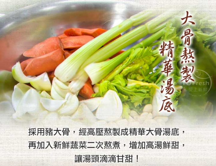 高湯包:水、豬骨、鹽、洋蔥、紅蘿蔔、蒜頭