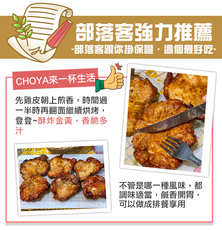 成分:雞肉、水、原味雞排料(大豆分離蛋白、多磷酸鈉、焦磷酸鈉(無水)、麥芽糊精、乾酪素鈉、L-麩酸鈉、DL-胺基丙酸、5’-次黃嘌呤核苷磷酸二鈉、5’-鳥嘌呤核苷磷酸二鈉、琥珀酸二鈉、白胡椒、香料、肉味香料(麥芽糊精、辛烯基丁二酸鈉澱粉、香料(含中鏈三酸甘油酯)、脂肪酸甘油酯、維生素E<抗氧化劑>)、小荳蔻、醋磺內酯鉀<甜味劑>)
