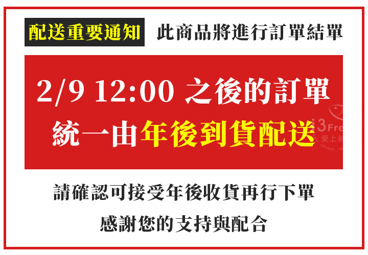 02/03(二)中午12點後~02/09(一)中午12點止已成立訂單.預計02/13(五)前陸續到貨