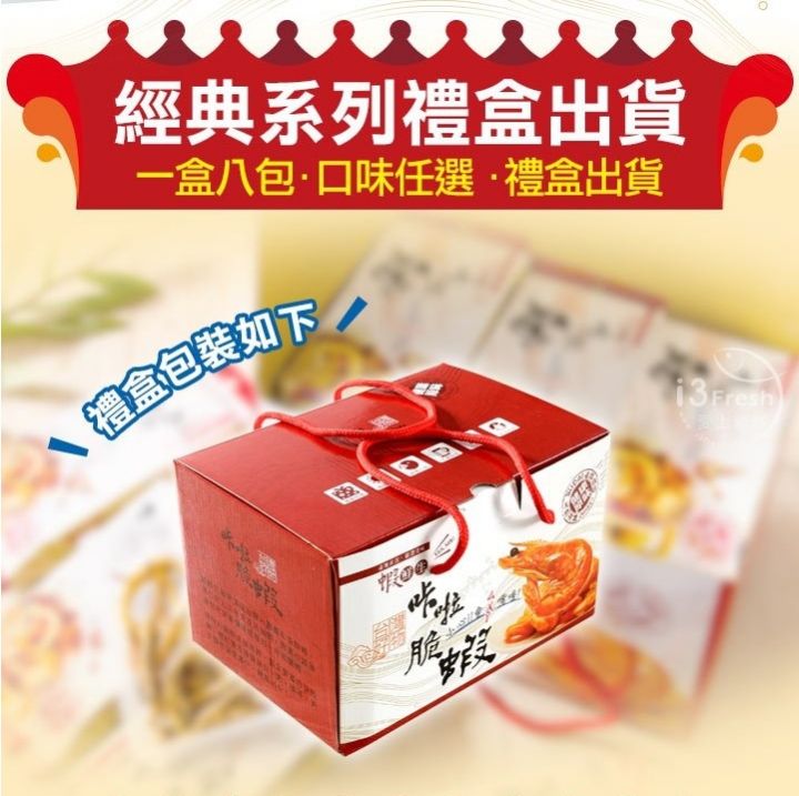 禮盒內含:咔啦蝦(經典原味)2包、咔啦蝦(四川麻辣)2包、卡拉脆魷(原味)2包、咔啦小卷(經典椒鹽)2包 ; 共8包