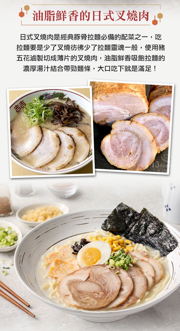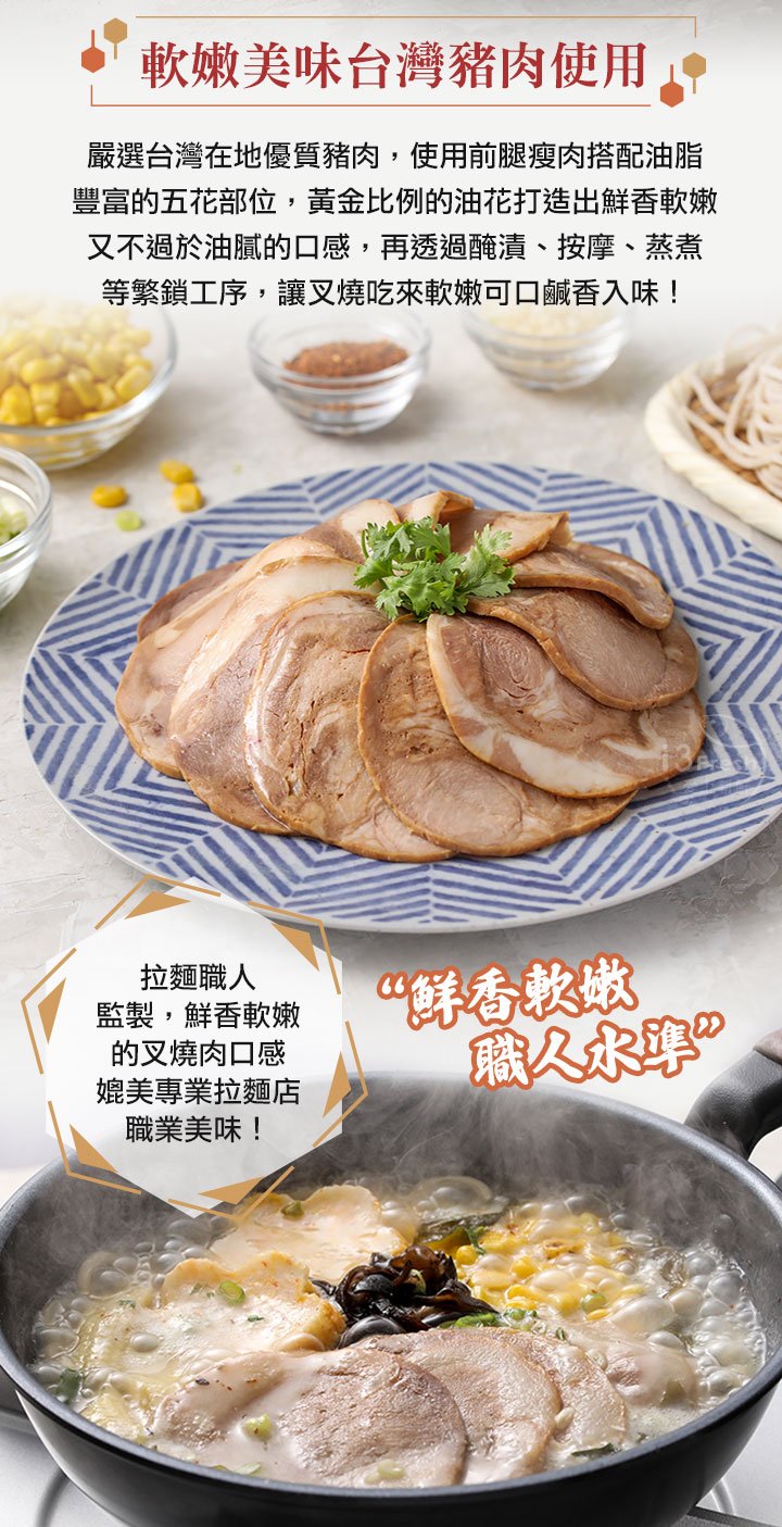 商品成分:豬肉(原產地:台灣)、醬油(水、脫脂大豆(非基因改造)、小麥、食鹽、轉化液糖(蔗糖、水)、酒精、琥珀酸二鈉、5'-次黃嘌呤核苷磷酸二鈉、5'-鳥嘌呤核苷磷酸二鈉、甜味劑(甘草素))、水、砂糖、血漿蛋白(豬血漿(比利時)、食鹽)、L-麩酸鈉、分離大豆蛋白、酵母粉(酵母粉、糯米澱粉、菜籽油)、豆瓣醬(非基因改造黃豆、蓬萊米、食鹽、高果糖漿、醇釀醬汁、蔗糖、酵母粉)、米酒、大蒜、多磷酸鈉、焦磷酸鈉、食鹽、焦糖色素、豬肉粉(豬肉抽出物、麥芽糊精、黃豆水解蛋白、醬油、酵母抽出物、蒜頭、卵磷脂、洋蔥、迷迭香抽出物)、薑、5'-次黃嘌呤核苷磷酸二鈉,5'-鳥嘌呤核苷磷酸二鈉、脂肪酸甘油酯、玉米糖膠、五香粉(小茴香、八角、肉桂、丁香、胡荽、香芹)、甘草粉、複方品質改良劑(酪蛋白鈉、脂肪酸蔗糖酯、碳酸鈉、麩醯胺轉胺酶、糊精)。