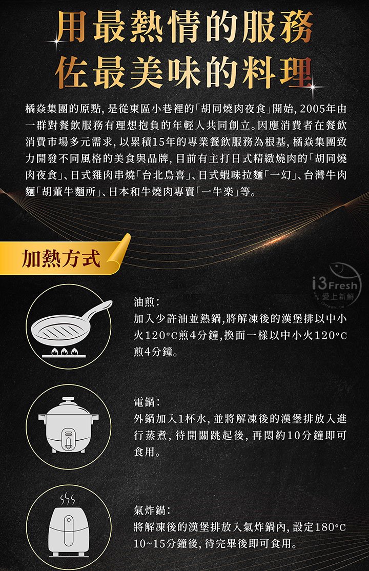 食用方式:加入少許油並熱鍋,將解凍後的漢堡排以中小火120度c煎四分鐘,換面一樣以中小火120度c煎四分鐘。