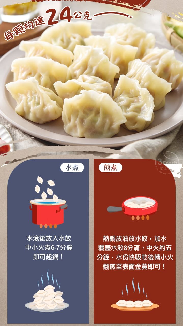 水煮:不須解凍,水滾後放入水餃,中小火煮6-7分鐘,等肉餡熟就可以起鍋。
