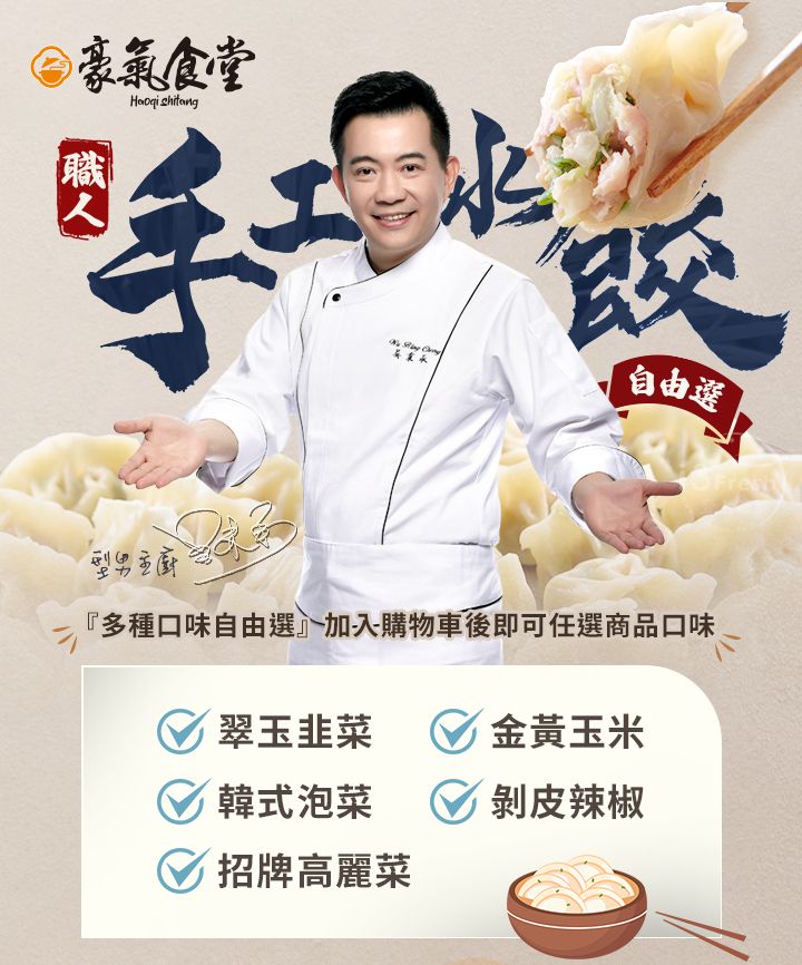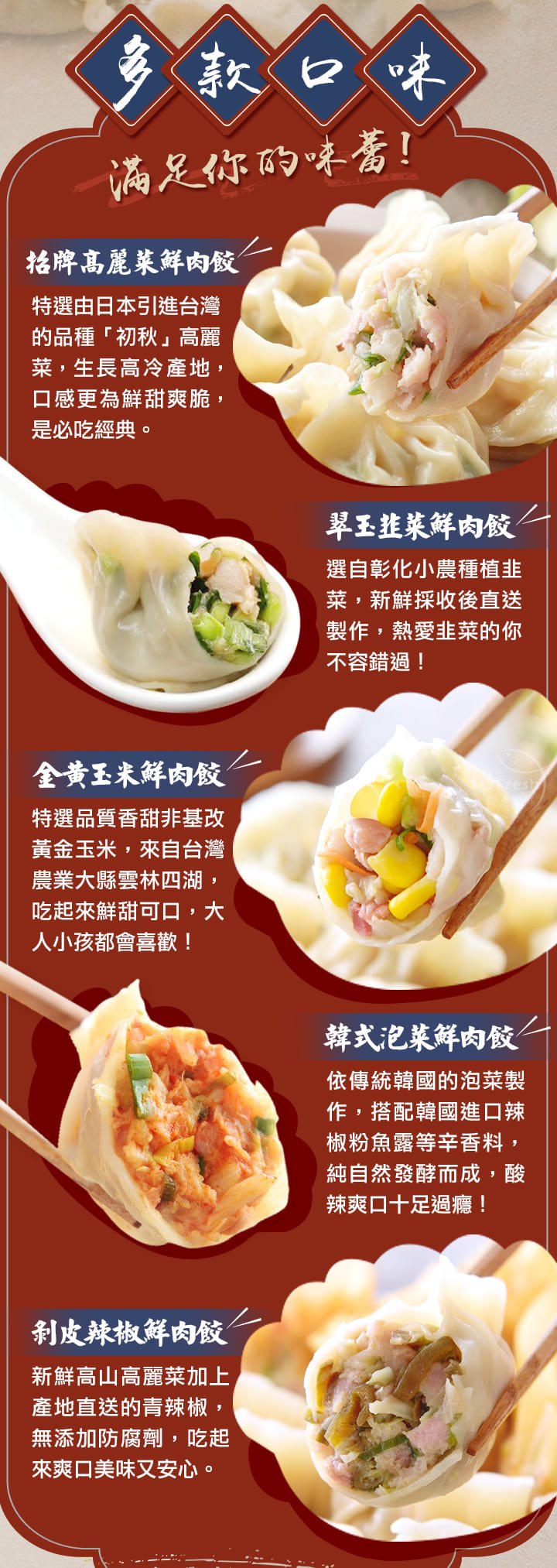商品成分:豬前腿肉(台灣豬肉)、韓式泡菜(大白菜、辣椒粉、蒜頭、鹽、蘋果、水糖、辣椒、L-麩酸鈉、玉米糖漿、薑、水梨、海藻糖、魚露(玉筋魚、鹽))、高麗菜、青蔥、餃皮(麵粉、水、食鹽、磷酸二澱粉)、薑、醬油(水、非基因改造黃豆(高蛋白豆片)、小麥、食鹽、酒精)、香油(大豆沙拉油、芝麻油)、米酒、雞粉(鹽,麥芽糊精,L-麩酸鈉,糖,玉米澱粉,雞肉粉,香料,酵母萃取物(酵母萃取物,鹽),雞油,棕櫚油(棕櫚油,硬質棕櫚油),調味劑(5'-次黃嘌呤核苷磷酸二鈉,5'-鳥嘌呤核苷磷酸二鈉),白胡椒)、海鹽、糖、白胡椒