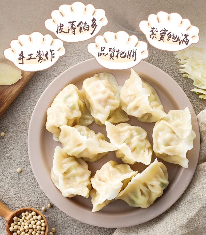 商品成分:豬前腿肉(台灣)、高麗菜、青蔥、高湯(水、洋蔥、紅蘿蔔、芹菜、雞骨、豬皮(台灣)、昆布、柴魚片)、餃皮(麵粉、水、食鹽、磷酸二澱粉)、薑末、醬油(水、非基因改造黃豆(高蛋白豆片)、小麥、食鹽、酒精)、香油(大豆沙拉油、芝麻油)、米酒、雞粉(鹽、麥芽糊精、L-麩酸鈉、糖、玉米澱粉、雞肉粉、香料、酵母萃取物(酵母萃取物、鹽)、雞油、棕櫚油(棕櫚油、硬質棕櫚油)、調味劑(5'-次黃嘌呤核苷磷酸二鈉、5'-鳥嘌呤核苷磷酸二鈉)、白胡椒)、海鹽、糖、白胡椒