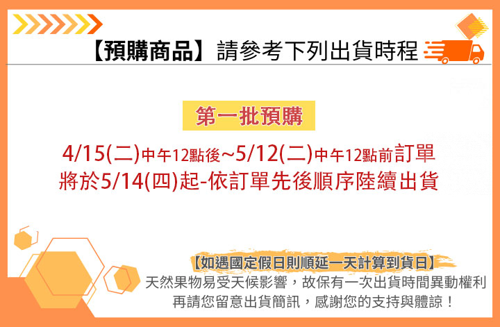 3. 訂單款項須於販售時間內完成付款,若未完成付款之訂單,將安排於下次出貨,造成不便敬請原諒。