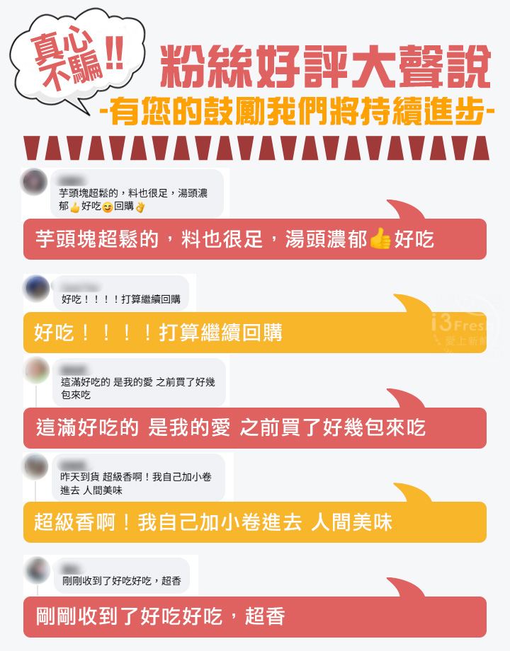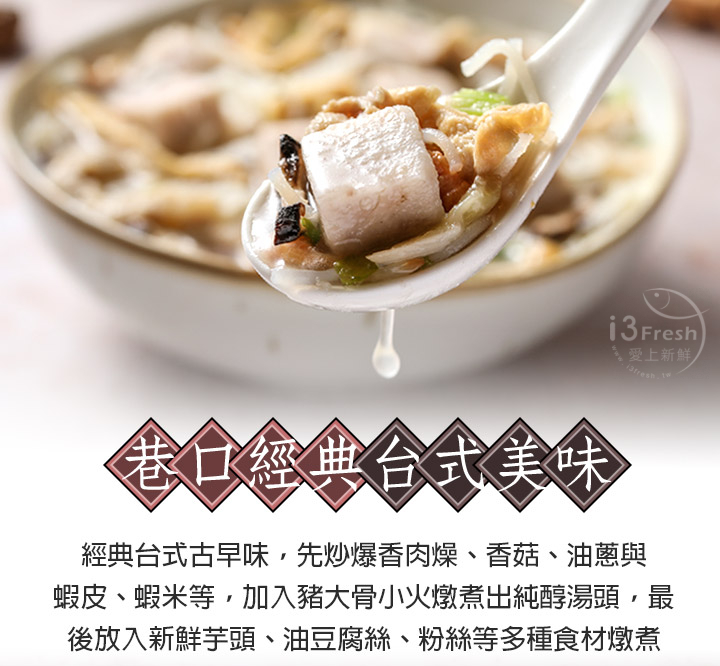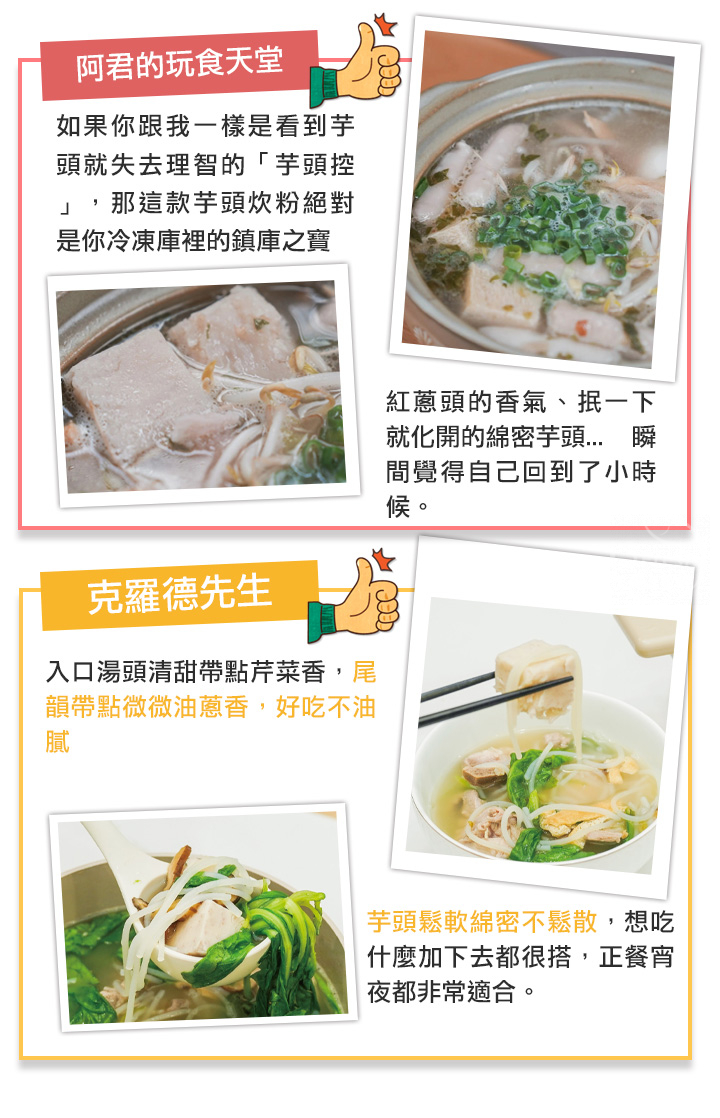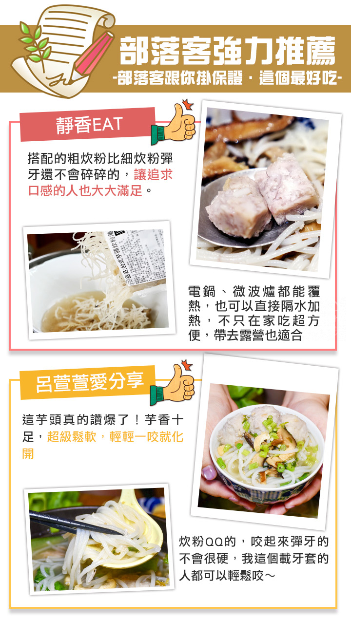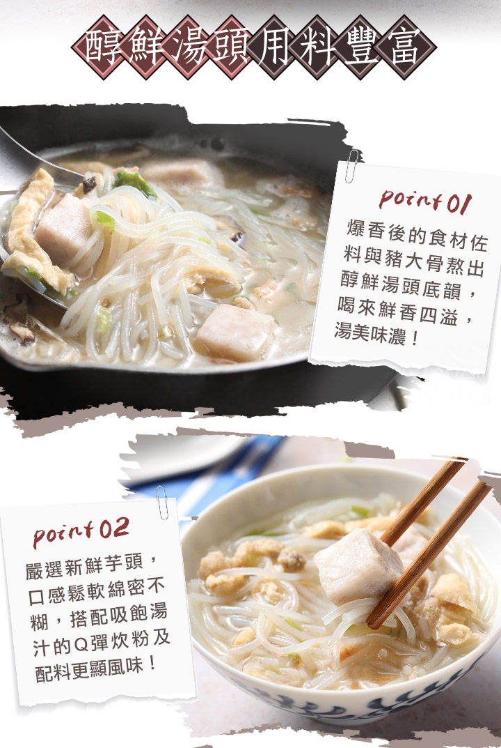 商品成分:水、炊粉(玉米澱粉、在來米粉、品質改良劑(重合磷酸鹽(偏磷酸鈉、多磷酸鈉、磷酸二氫鈉、焦磷酸鈉))、羧甲基纖維素鈉、多丙烯酸鈉(黏稠劑)、脂肪酸甘油酯(乳化劑))、芋頭、芹菜、豬絞肉(台灣)、油豆腐(水、黃豆、氯化鈣、棕櫚油、大豆油、芥花油、脂肪酸甘油酯、碳酸鈣、卵磷脂)、米酒、鹽、大骨湯粉(鹽、L-麩酸鈉、麥芽糊精、糖、玉米澱粉、香料、棕櫚油、酵母萃取物、豬肉粉(豬肉(台灣)、鹽、多磷酸鈉、複合調味劑(乳糖、DL-胺基丙酸、調味劑(5'-次黃嘌呤核苷磷酸二鈉、5'-鳥嘌呤核苷磷酸二鈉)、胺基乙酸、琥珀酸二鈉、檸檬酸鈉)、糖,抗氧化劑(維生素E))、洋蔥粉、5'-次黃嘌呤核苷磷酸二鈉、5'-鳥嘌呤核苷磷酸二鈉、明膠、白胡椒)、油蔥酥(紅蔥頭、麥纖麩皮、洋蔥、棕櫚油、玉米澱粉、樹薯粉)、乾香菇、大豆沙拉油、豬油(台灣)、糖、蝦皮、醬油、味精、蒜頭、白胡椒粉、蝦米。