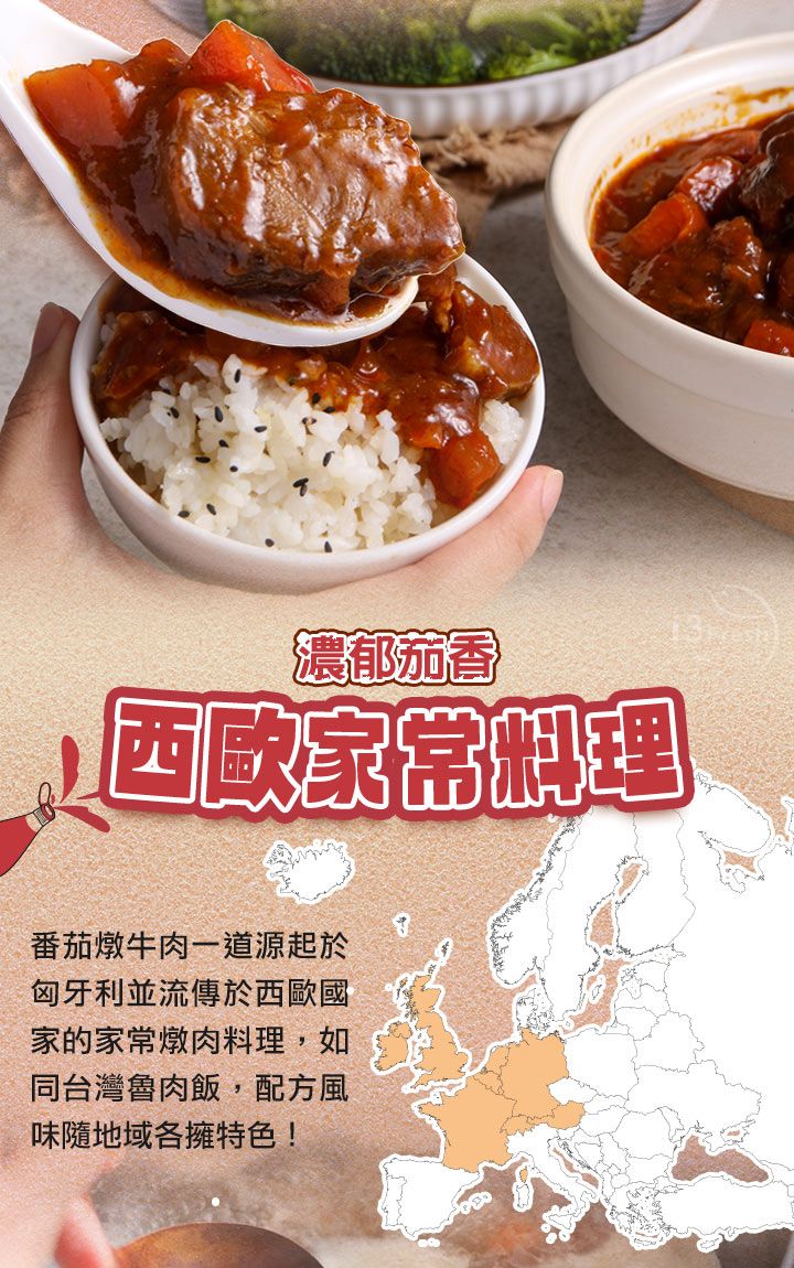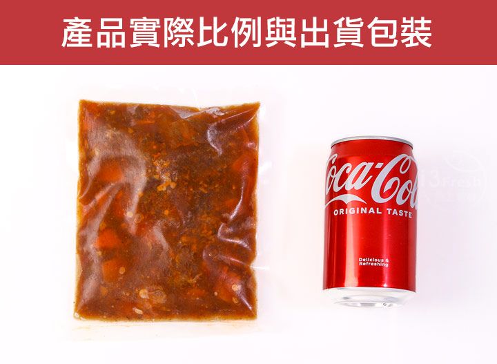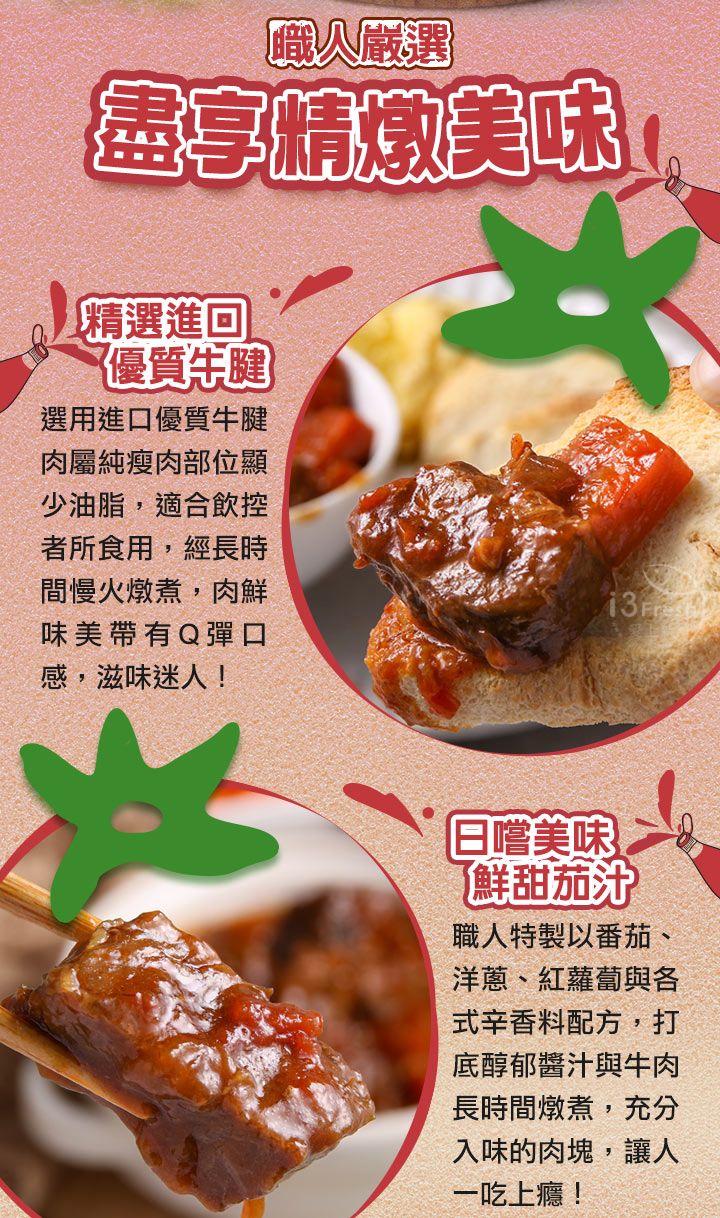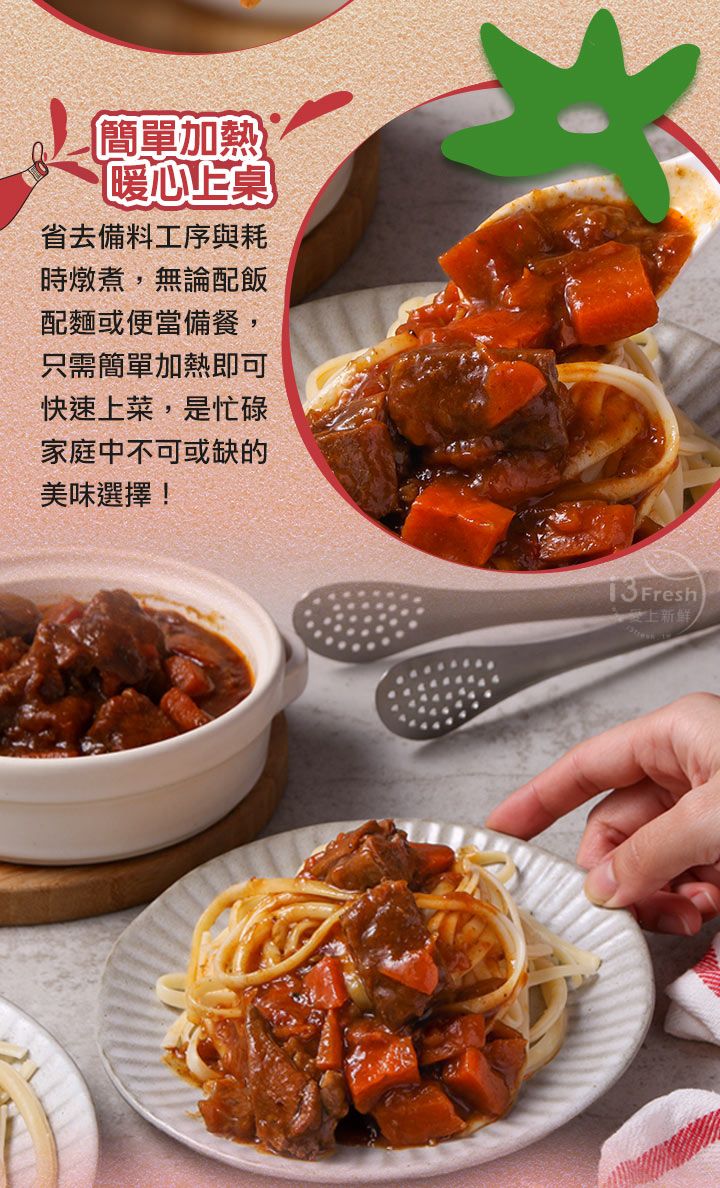 商品成分:水、牛肉、紅蘿蔔、洋蔥、番茄醬(水、蕃茄糊、蔗糖、釀造醋、食鹽、香辛料(白胡椒、肉桂、紅辣椒、薑、丁香、肉豆蔻、芥末、月桂葉、眾香子))、醬油、番茄、米酒、沙茶醬(黃豆油、魚、南薑粉、蒜、小麥麩皮、芝麻粉、味精、蔥干、椰子粉、辣椒粉、蝦、蔥酥(蔥頭、棕櫚油、玉米澱粉)、香辛料(甘草、大茴香、桂枝、丁香)、鹽、豆蔻、5'-次黃嘌呤核苷磷酸二鈉、5'-鳥嘌呤核苷磷酸二鈉、花椒粉、白胡椒粉)、糖、乙醯化己二酸二澱粉、蒜頭、蔥、咖哩粉(薑黃、小茴、大茴香、肉桂、辣椒粉、胡椒粉、胡荽子)、味鮮(L-麩酸鈉、胺基乙酸、琥珀酸二鈉、岩鹽、5'-次黃嘌呤核苷磷酸二鈉、5'-鳥嘌呤核苷磷酸二鈉)。