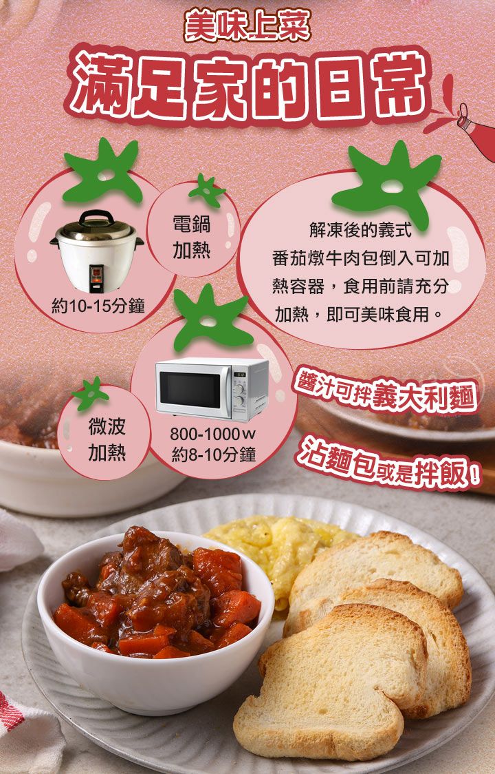 冷藏解凍至完全解凍。解凍後的調理包倒入容器,可電鍋加熱約10-15分鐘/微波加熱800W 5-7分鐘,至充分覆熱,方可食用。