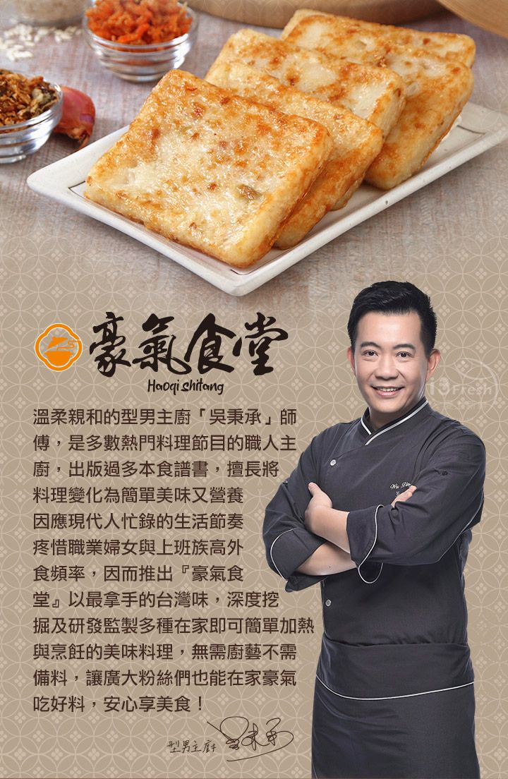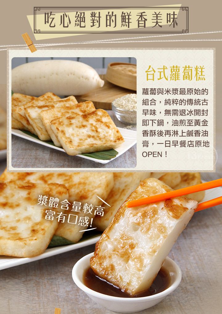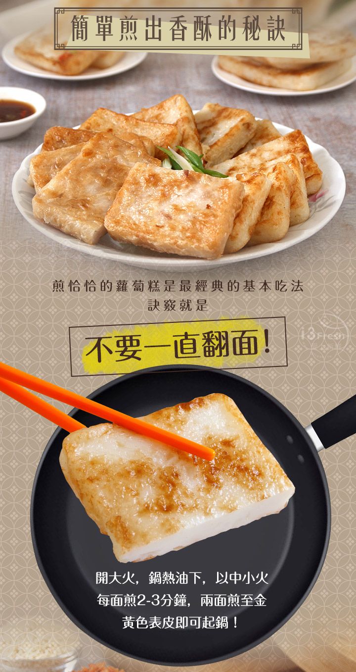 食用方式:產品無須解凍、1.煎:鍋內淋入些許油,熱鍋後(170℃-180℃),放入蘿蔔糕小火煎至兩面呈金黃色(各3分鐘)。 2.油炸:以中火(170℃-180℃)油炸5-6分鐘至金黃色即可食用。油鍋煎得同時不需反覆翻面、才能將中心溫度加熱至熟透。