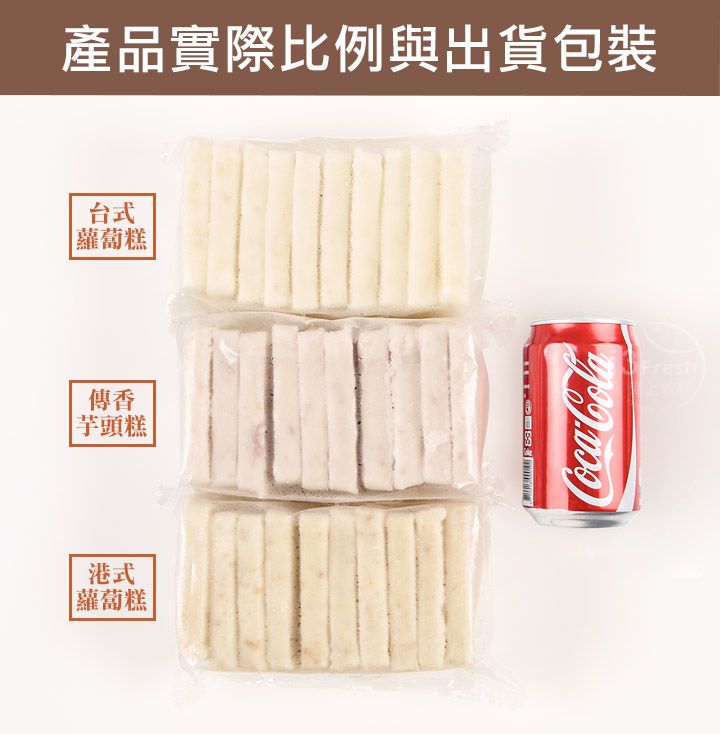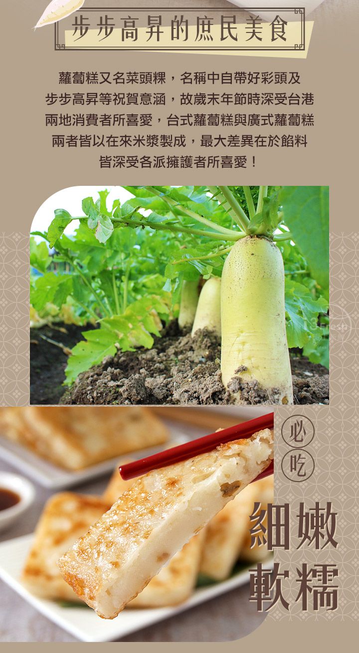商品成分:水、白蘿蔔、在來米、在來米粉(在來米、玉米粉)、玉米澱粉、大豆沙拉油、砂糖、豬肉(台灣)、 L-麩酸鈉(調味劑)、蔥酥(棕櫚油、紅蔥頭)、鹽、蝦米、芝麻香油(大豆油、芝麻油)、胡椒粉(白胡椒、地瓜纖維、綠辣椒粉)