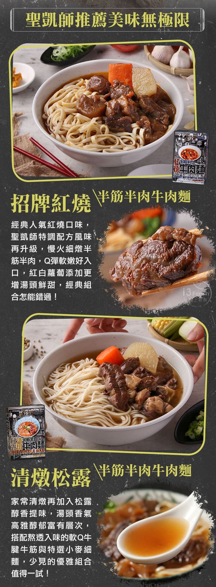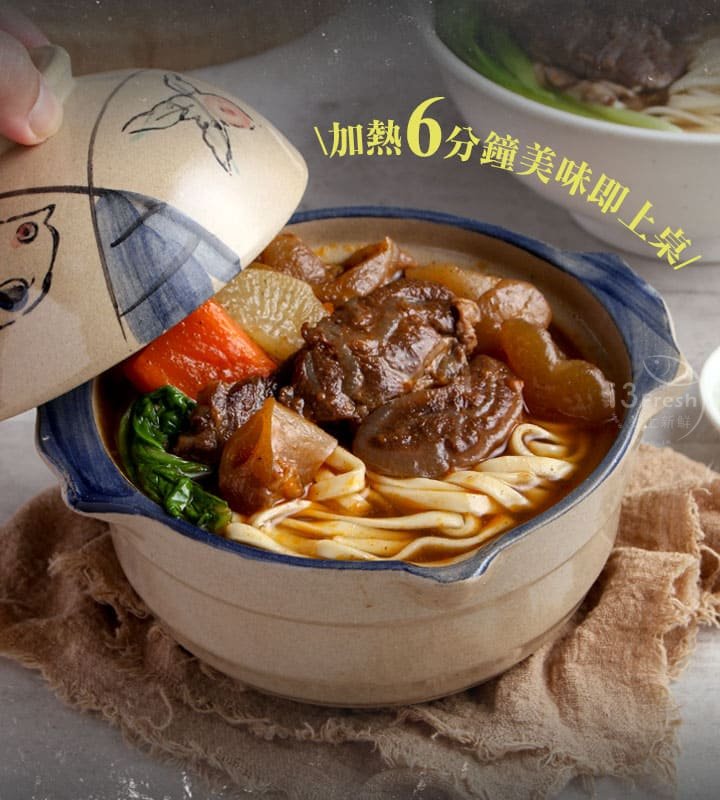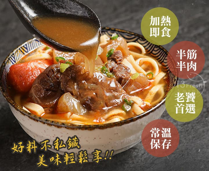 調理包成份:水、牛腱肉、牛筋、紅蘿蔔、白蘿蔔、牛骨、牛油、醬油【水、非基因改造脫脂大豆片、小麥、轉化液糖(蔗糖、水)、食鹽、酒精、酵母抽出物】、辣豆瓣醬【水、砂糖、非基因改造黃豆、辣椒、鹽、純釀造醋】、黑豆瓣醬【非基因改造黃豆、蠶豆、米、小麥、辣椒、鹽、焦糖色素】、米豆醬【非基因改造黃豆、糙米、鹽、糖、水、食品級酒精、調味劑(5'-次黃嘌呤核苷磷酸二鈉、5'-鳥嘌呤核苷磷酸二鈉、L-麩酸鈉)、品質改良劑(偏磷酸鈉、無水焦磷酸鈉)、甜味劑(醋磺內酯鉀)】、洋蔥、牛番茄、番茄糊【番茄、檸檬酸】、米酒【米、精製食用酒精】、鹽、砂糖、蒜頭、薑片、白荳蔻、八角、肉桂、甘草、陳皮、當歸、草果、砂仁。