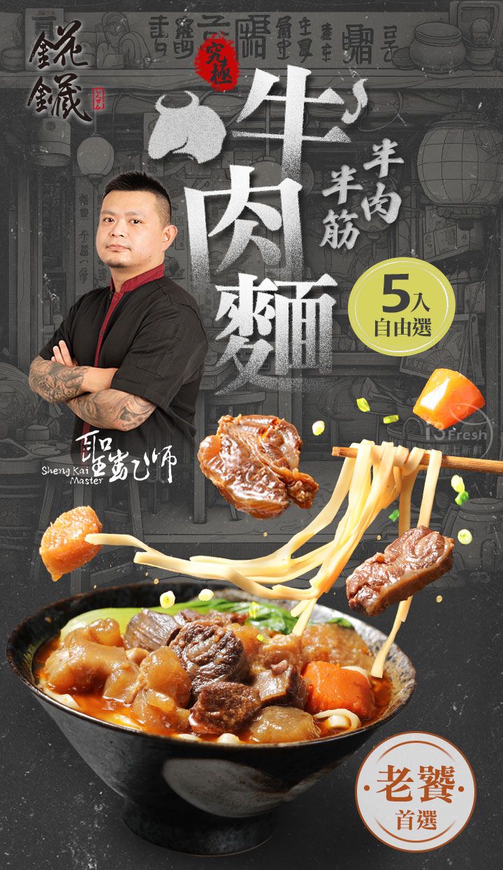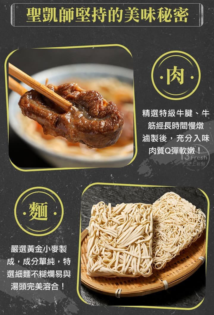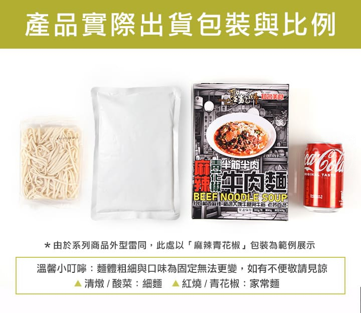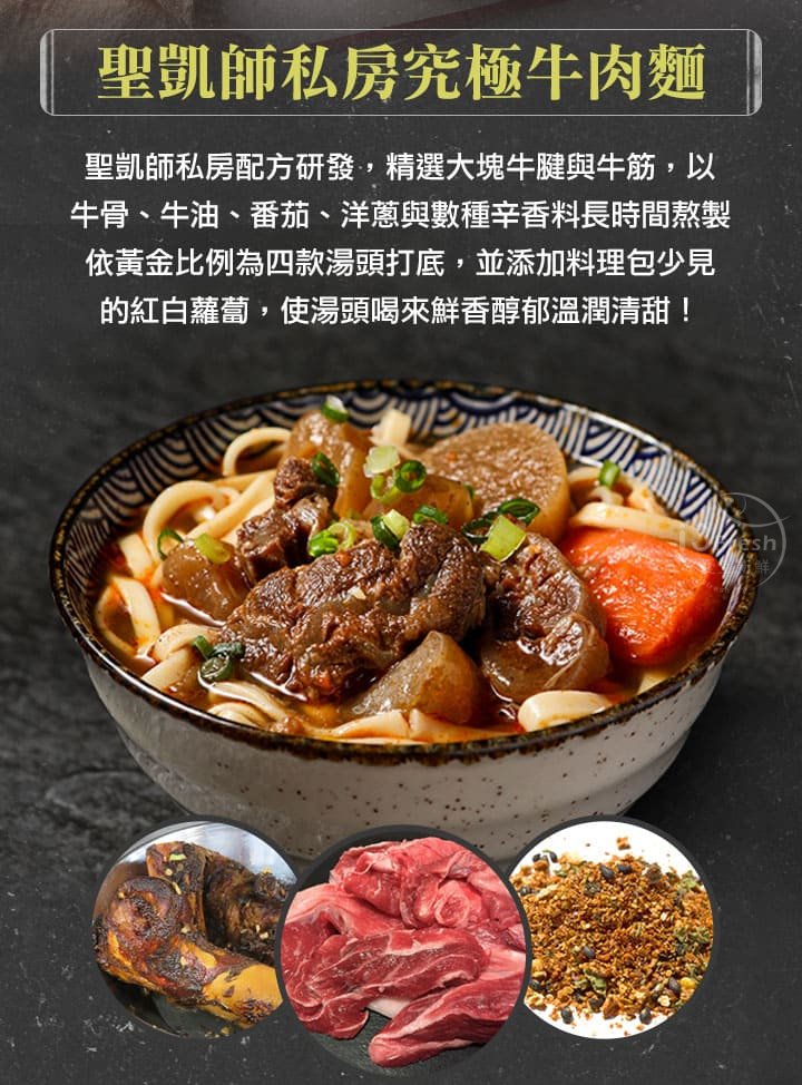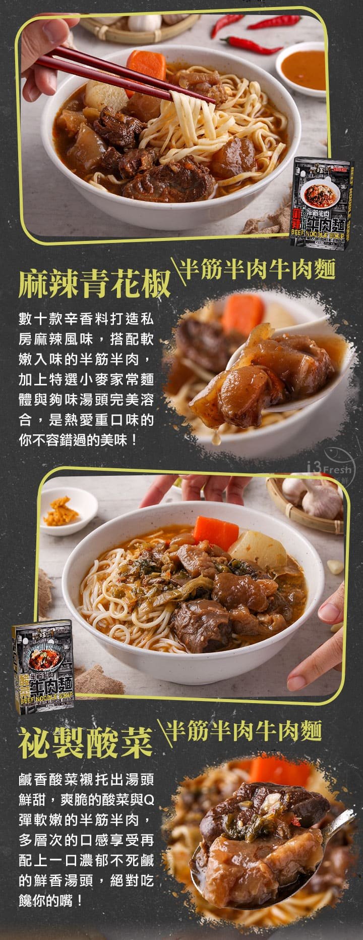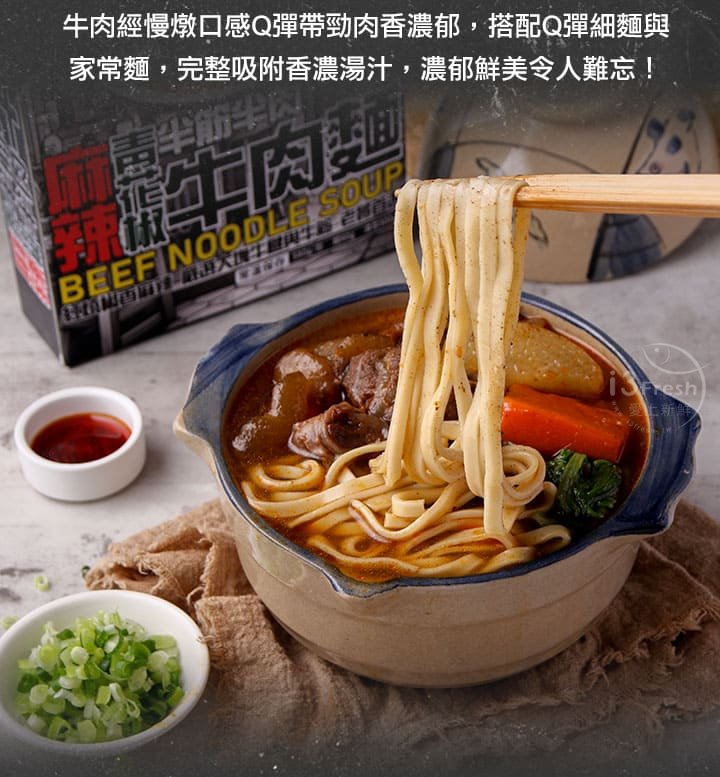 調理包成份:水、牛腱肉、牛筋、紅蘿蔔、白蘿蔔、牛骨、牛油、麻辣醬【大豆沙拉油、紅蔥頭、蒜頭、蠶豆、非基因改造黃豆、小麥、米、食鹽、砂糖、辣椒、小茴香、豆蔻、甘草、草果、青花椒】、醬油【水、非基因改造脫脂大豆片、小麥、轉化液糖(蔗糖、水)、食鹽、酒精、酵母抽出物】、辣豆瓣醬【水、砂糖、非基因改造黃豆、辣椒、鹽、純釀造醋】、黑豆瓣醬【非基因改造黃豆、蠶豆、米、小麥、辣椒、鹽、焦糖色素】、米豆醬【非基因改造黃豆、糙米、鹽、糖、水、食品級酒精、調味劑(5'-次黃嘌呤核苷磷酸二鈉、5'-鳥嘌呤核苷磷酸二鈉、L-麩酸鈉)、品質改良劑(偏磷酸鈉、無水焦磷酸鈉)、甜味劑(醋磺內酯鉀)】、洋蔥、牛番茄、番茄糊【番茄、檸檬酸】、米酒【米、精製食用酒精】、鹽、砂糖、蒜頭、薑片、白荳蔻、八角、肉桂、甘草、陳皮、當歸、草果、砂仁。