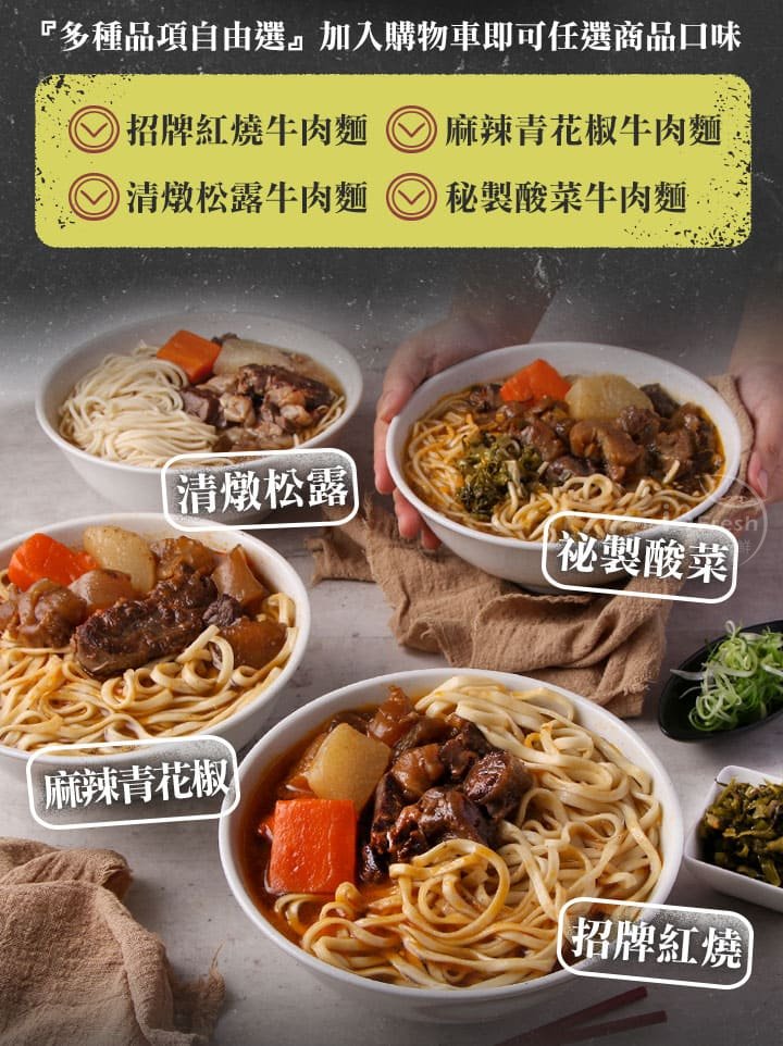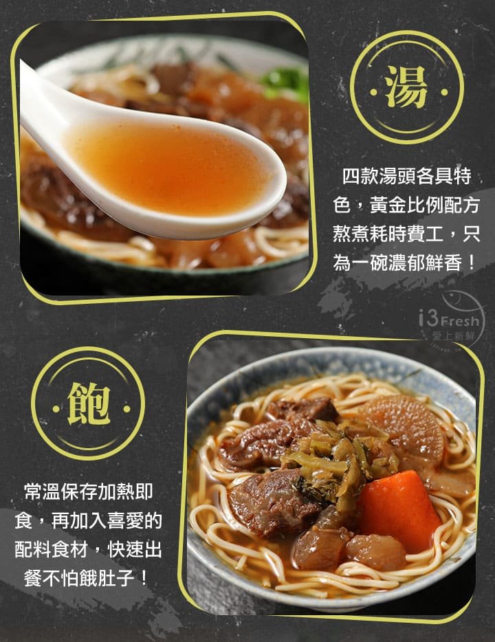 調理包成份:水、牛腱肉、牛筋、酸菜【梅乾菜、酸菜{芥菜、鹽巴}、大豆沙拉油、辣椒、丁香魚乾、蝦米、菜脯{白蘿蔔、鹽巴}、黑豆鼓{黑豆、鹽巴}、香菇素蠔油{水、蔗糖轉化液糖、非基因改造黃豆(高蛋白豆片)、小麥、食鹽、黏稠劑(玉米糖膠、乙醯化己二酸二澱粉)、酵母抽出物、苯甲酸鈉(防腐劑)、香菇粉}、蒜頭、白芝麻、白砂糖、辣椒粉、柴魚粉{鹽、味精、柴魚抽出物、糖、麥芽糊精、鯖魚粉、鰹魚粉、二氧化矽}、胡椒粉】、紅蘿蔔、白蘿蔔、牛骨、牛油、醬油【水、非基因改造脫脂大豆片、小麥、轉化液糖(蔗糖、水)、食鹽、酒精、酵母抽出物】、辣豆瓣醬【水、砂糖、非基因改造黃豆、辣椒、鹽、純釀造醋】、黑豆瓣醬【非基因改造黃豆、蠶豆、米、小麥、辣椒、鹽、焦糖色素】、米豆醬【非基因改造黃豆、糙米、鹽、糖、水、食品級酒精、調味劑(5'-次黃嘌呤核苷磷酸二鈉、5'-鳥嘌呤核苷磷酸二鈉、L-麩酸鈉)、品質改良劑(偏磷酸鈉、無水焦磷酸鈉)、甜味劑(醋磺內酯鉀)】、洋蔥、牛番茄、番茄糊【番茄、檸檬酸】、米酒【米、精製食用酒精】、鹽、砂糖、蒜頭、薑片、白荳蔻、八角、肉桂、甘草、陳皮、當歸、草果、砂仁。