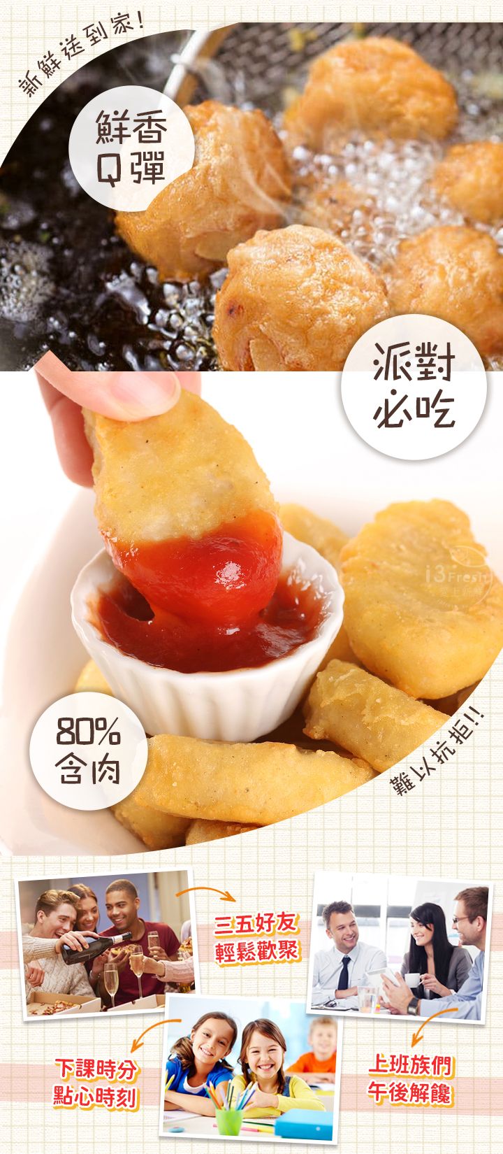 產品成份:雞肉(組合)、雞皮、裹漿粉[麵粉、玉米澱粉(非基改)、胡椒、大豆油、水解大豆蛋白(非基改)、酸性焦磷酸鈉、碳酸氫鈉、L-麩酸鈉]、精製軟棕油、大豆蛋白(非基改)、鹽、味精、馬鈴薯澱粉、玉米澱粉(非基改)、多磷酸鈉、焦磷酸鈉、偏磷酸鉀、小麥蛋白、胺基乙酸、DL-胺基丙酸、糖、琥珀酸二鈉、5'-鳥嘌呤核苷磷酸二鈉、5'-次黃嘌呤核苷磷酸二鈉、麥芽糊精、雞油、香料、酵素製劑(甘油、麥芽糖醇、谷氨酰胺轉氨酶)
