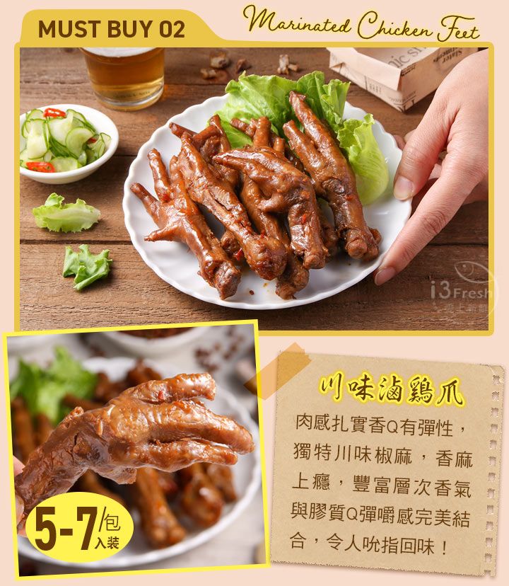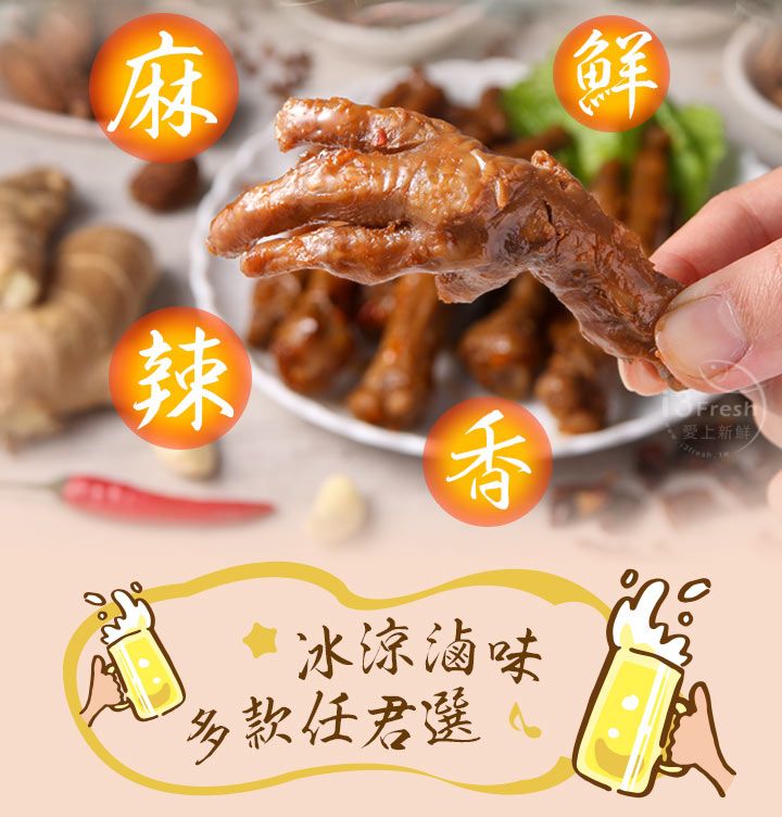 成分:雞爪、水、醬油、米酒、砂糖、大豆沙拉油、蒜、薑、蔥、白糖、冰糖、豬油(台灣)、洋蔥、香菇素蠔油(黑豆、蔗糖、海鹽、糯米、昆布、香菇)、鹽、鮮美露(釀造醬油(使用非基因改造大豆)、風味調味液(食鹽、酒精、昆布、柴魚(鰹魚)、干貝)、轉化液糖(蔗糖、水)、水、食鹽、釀造醋(米醋)、酒精、酵母抽出物)、花雕酒(糯米、水、小麥) 、黑胡椒粉、白胡椒粉、洋蔥粉、蒜粉、孜然粉、乾辣椒、花椒、青花椒、五香粉(八角、肉桂、茴香子、花椒、丁香)、肉桂粉、中藥包(八角、小茴香、多香果、肉桂、高良薑、白芷、草果、蓽茇、花椒、山奈、丁香)