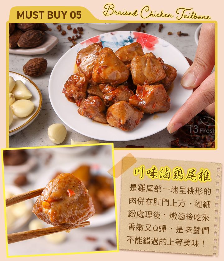 成分:雞屁股、水、醬油、米酒、砂糖、大豆沙拉油、蒜、薑、蔥、白糖、冰糖、豬油(台灣)、洋蔥、香菇素蠔油(黑豆、蔗糖、海鹽、糯米、昆布、香菇)、鹽、鮮美露(釀造醬油(使用非基因改造大豆)、風味調味液(食鹽、酒精、昆布、柴魚(鰹魚)、干貝)、轉化液糖(蔗糖、水)、水、食鹽、釀造醋(米醋)、酒精、酵母抽出物)、花雕酒(糯米、水、小麥) 、黑胡椒粉、白胡椒粉、洋蔥粉、蒜粉、孜然粉、乾辣椒、花椒、青花椒、五香粉(八角、肉桂、茴香子、花椒、丁香)、肉桂粉、中藥包(八角、小茴香、多香果、肉桂、高良薑、白芷、草果、蓽茇、花椒、山奈、丁香)
