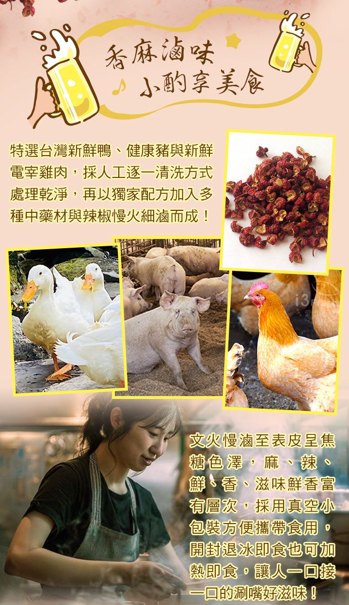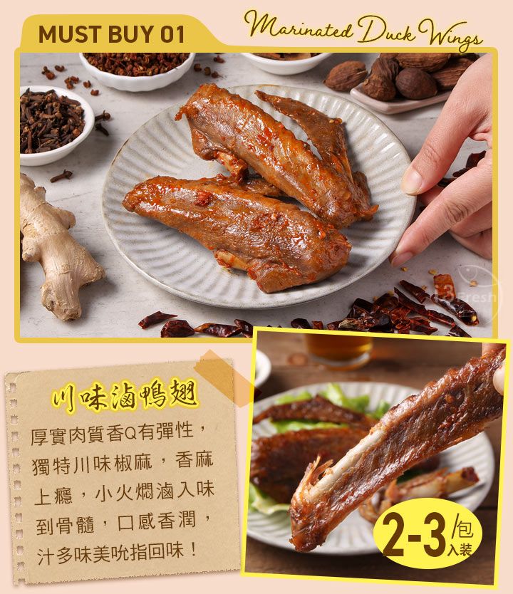 成分:鴨翅、水、醬油、米酒、砂糖、大豆沙拉油、蒜、薑、蔥、白糖、冰糖、豬油(台灣)、洋蔥、香菇素蠔油(黑豆、蔗糖、海鹽、糯米、昆布、香菇)、鹽、鮮美露(釀造醬油(使用非基因改造大豆)、風味調味液(食鹽、酒精、昆布、柴魚(鰹魚)、干貝)、轉化液糖(蔗糖、水)、水、食鹽、釀造醋(米醋)、酒精、酵母抽出物)、花雕酒(糯米、水、小麥) 、黑胡椒粉、白胡椒粉、洋蔥粉、蒜粉、孜然粉、乾辣椒、花椒、青花椒、五香粉(八角、肉桂、茴香子、花椒、丁香)、肉桂粉、中藥包(八角、小茴香、多香果、肉桂、高良薑、白芷、草果、蓽茇、花椒、山奈、丁香)