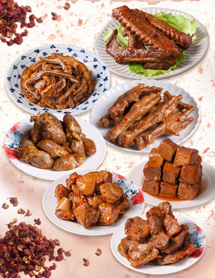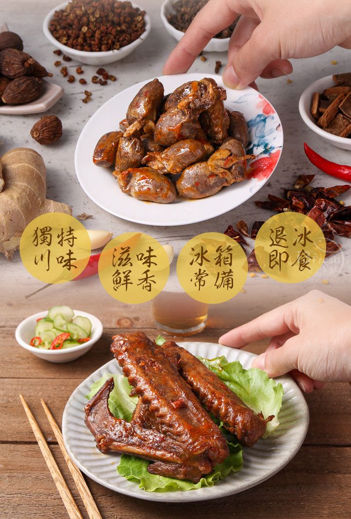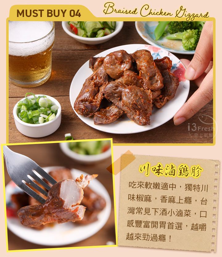 成分:雞胗、水、醬油、米酒、砂糖、大豆沙拉油、蒜、薑、蔥、白糖、冰糖、豬油(台灣)、洋蔥、香菇素蠔油(黑豆、蔗糖、海鹽、糯米、昆布、香菇)、鹽、鮮美露(釀造醬油(使用非基因改造大豆)、風味調味液(食鹽、酒精、昆布、柴魚(鰹魚)、干貝)、轉化液糖(蔗糖、水)、水、食鹽、釀造醋(米醋)、酒精、酵母抽出物)、花雕酒(糯米、水、小麥) 、黑胡椒粉、白胡椒粉、洋蔥粉、蒜粉、孜然粉、乾辣椒、花椒、青花椒、五香粉(八角、肉桂、茴香子、花椒、丁香)、肉桂粉、中藥包(八角、小茴香、多香果、肉桂、高良薑、白芷、草果、蓽茇、花椒、山奈、丁香)