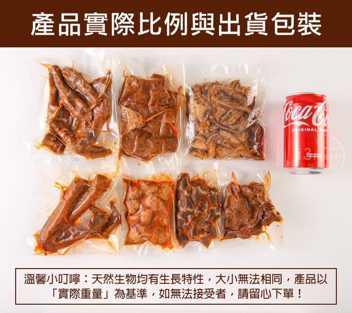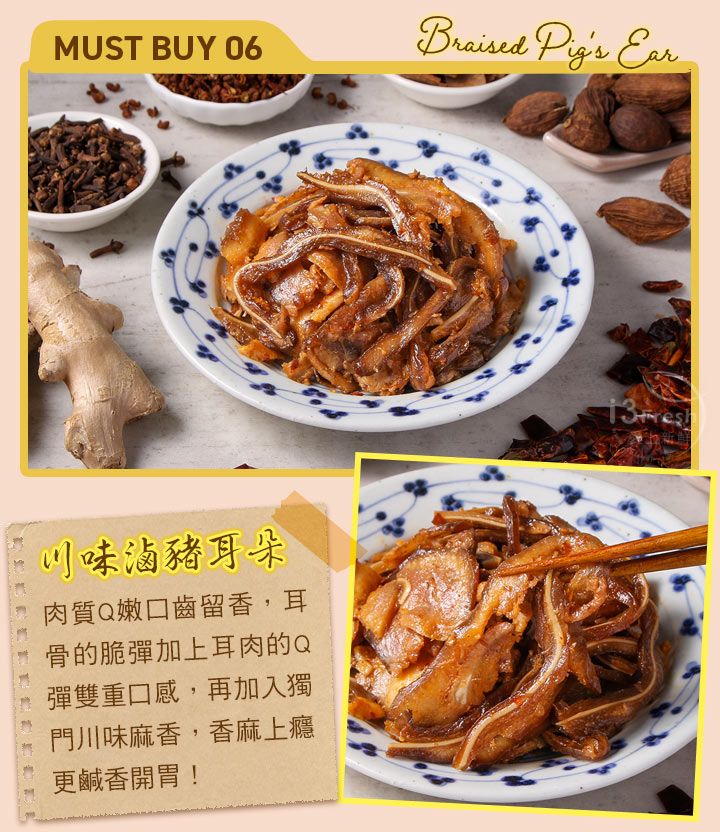 成分:豬耳朵(台灣)、水、醬油、米酒、砂糖、大豆沙拉油、蒜、薑、蔥、白糖、冰糖、豬油(台灣)、洋蔥、香菇素蠔油(黑豆、蔗糖、海鹽、糯米、昆布、香菇)、鹽、鮮美露(釀造醬油(使用非基因改造大豆)、風味調味液(食鹽、酒精、昆布、柴魚(鰹魚)、干貝)、轉化液糖(蔗糖、水)、水、食鹽、釀造醋(米醋)、酒精、酵母抽出物)、花雕酒(糯米、水、小麥) 、黑胡椒粉、白胡椒粉、洋蔥粉、蒜粉、孜然粉、乾辣椒、花椒、青花椒、五香粉(八角、肉桂、茴香子、花椒、丁香)、肉桂粉、中藥包(八角、小茴香、多香果、肉桂、高良薑、白芷、草果、蓽茇、花椒、山奈、丁香)