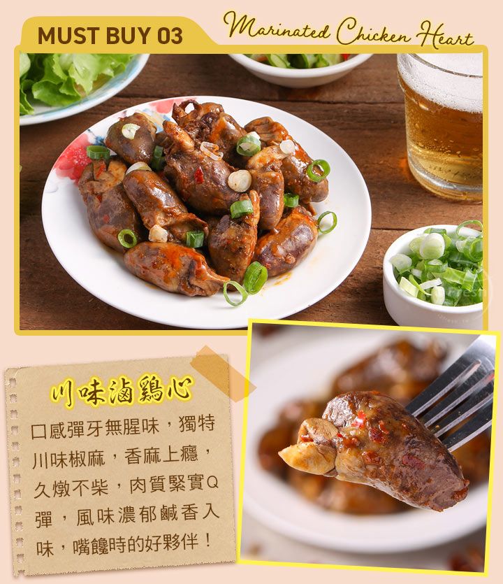 成分:雞心、水、醬油、米酒、砂糖、大豆沙拉油、蒜、薑、蔥、白糖、冰糖、豬油(台灣)、洋蔥、香菇素蠔油(黑豆、蔗糖、海鹽、糯米、昆布、香菇)、鹽、鮮美露(釀造醬油(使用非基因改造大豆)、風味調味液(食鹽、酒精、昆布、柴魚(鰹魚)、干貝)、轉化液糖(蔗糖、水)、水、食鹽、釀造醋(米醋)、酒精、酵母抽出物)、花雕酒(糯米、水、小麥) 、黑胡椒粉、白胡椒粉、洋蔥粉、蒜粉、孜然粉、乾辣椒、花椒、青花椒、五香粉(八角、肉桂、茴香子、花椒、丁香)、肉桂粉、中藥包(八角、小茴香、多香果、肉桂、高良薑、白芷、草果、蓽茇、花椒、山奈、丁香)