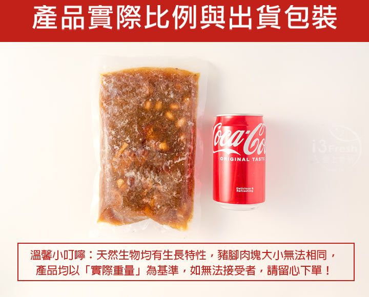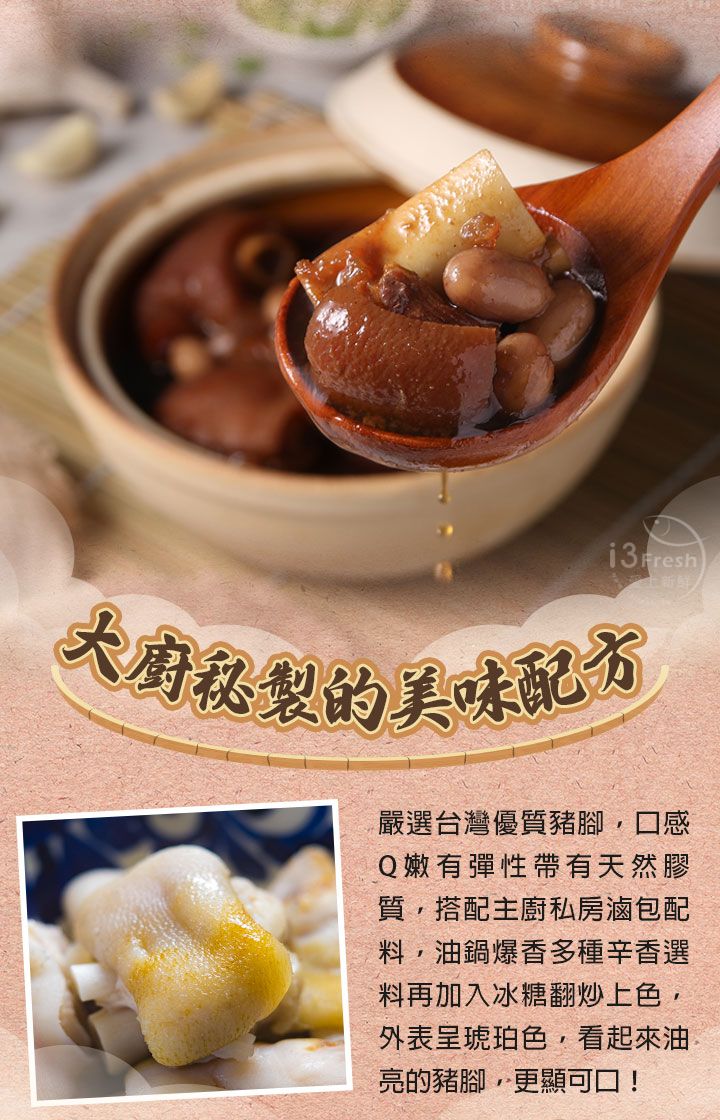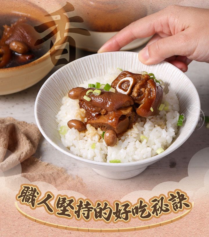 成分:水、豬腳(台灣)、醬油、冰糖、米酒、蒜頭、薑、蔥、花生、滷包(小茴香、花椒、陳皮、八角、桂枝、山奈、甘草、肉桂、當歸、川芎)、味鮮(L-麩酸鈉、胺基乙酸、琥珀酸二鈉、岩鹽、5'-次黃嘌呤核苷磷酸二鈉、5'-鳥嘌呤核苷磷酸二鈉)。