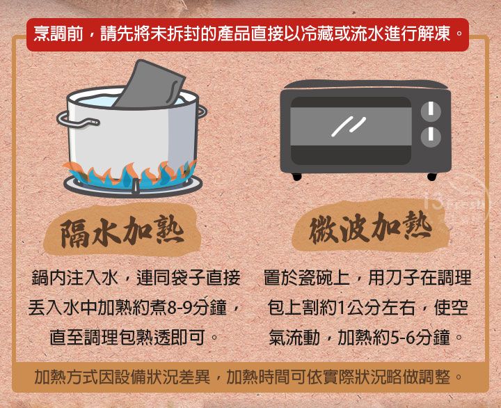 烹調前請先將未拆封的產品直接以冷藏或流水進行解凍。解凍後的調理包倒入容器: