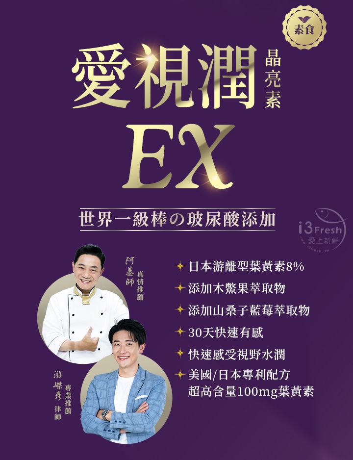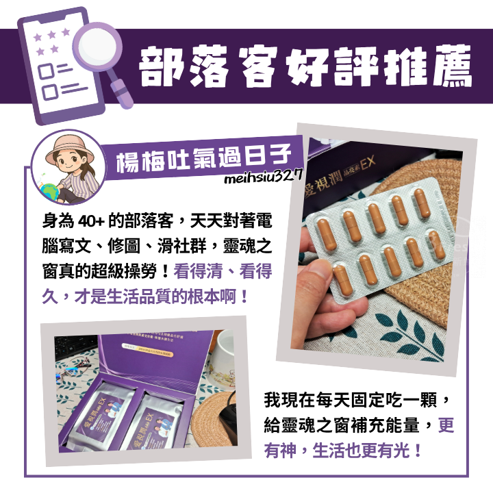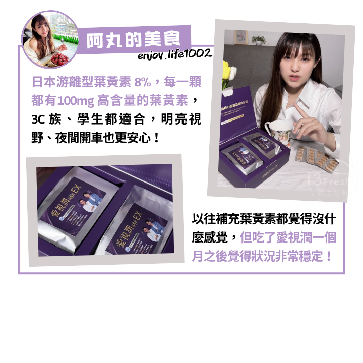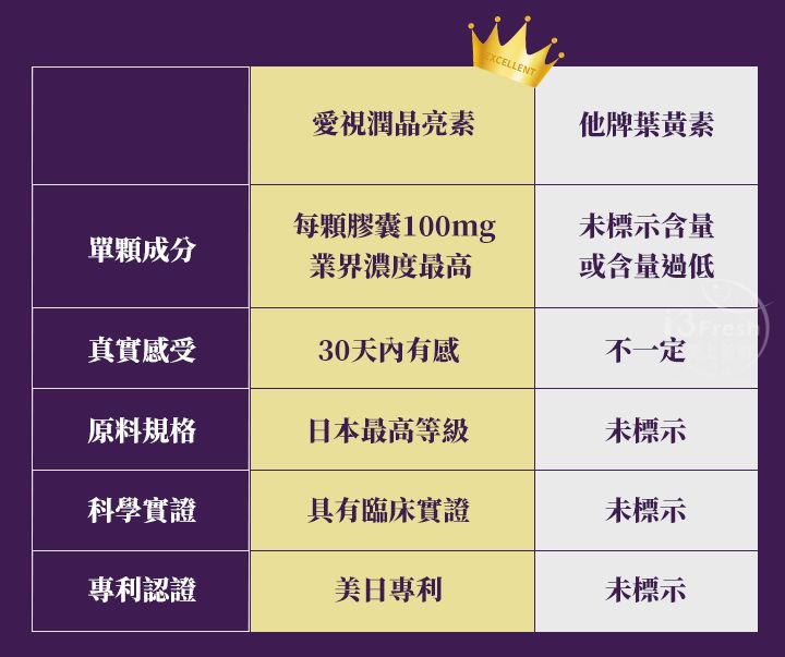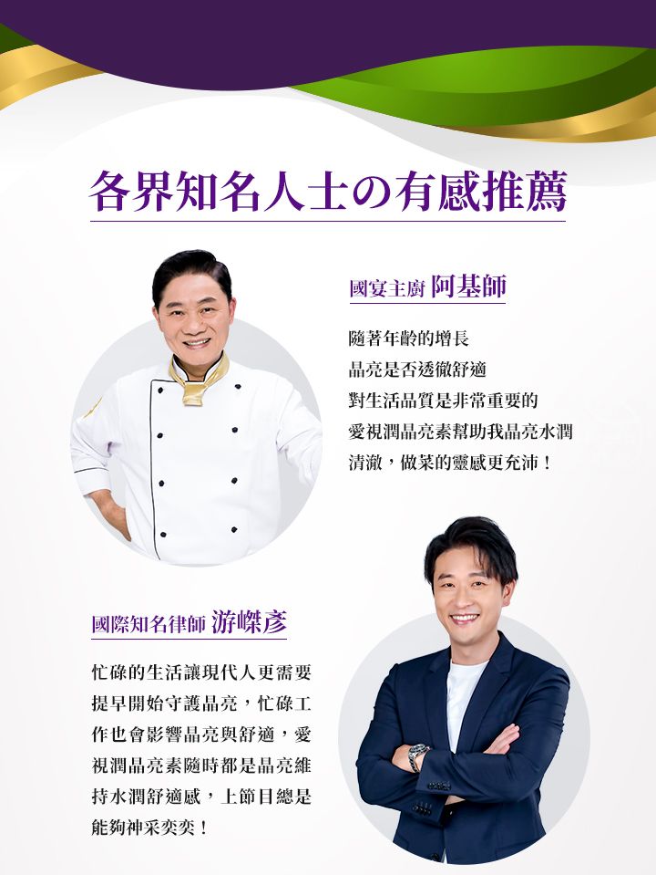 產品成分:木鱉果萃取粉(木鱉果萃取物、麥芽糊精)、日本專利金盞花萃取粉(糊精、金盞花萃取物(含葉黃素)、抗壞血酸)、微結晶狀α-纖維素、刺梨原漿凍乾粉(刺梨原漿"麥芽糊精)、流行鏈球菌發酵物(含透明質酸鈉)、金盞花萃取粉(糊精、金盞花萃取物(含消旋玉米黃質素))、決明子萃取粉(決明子萃取物、麥芽糊精)、枸杞萃取粉(枸杞萃取物、麥芽糊精)、葡萄籽萃取物、松樹皮萃取物(松樹皮、麥芽糊精)、黑醋栗萃取粉(黑醋栗萃取物、麥芽糊精)、小米草萃取粉(小米草萃取物、麥芽糊精)、藍莓萃取粉、山桑子萃取粉(含山桑子萃取物、麥芽糊精)。