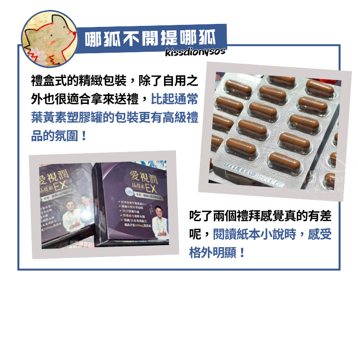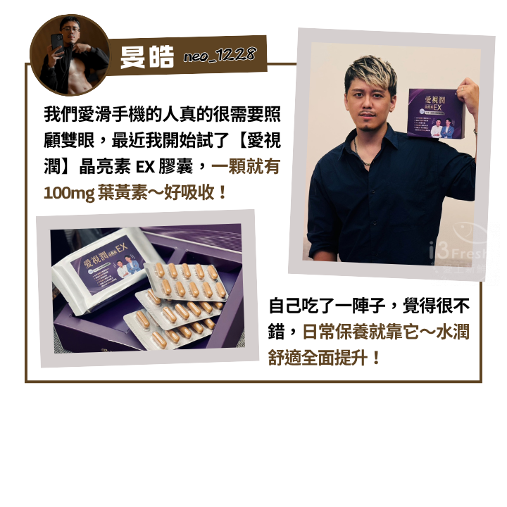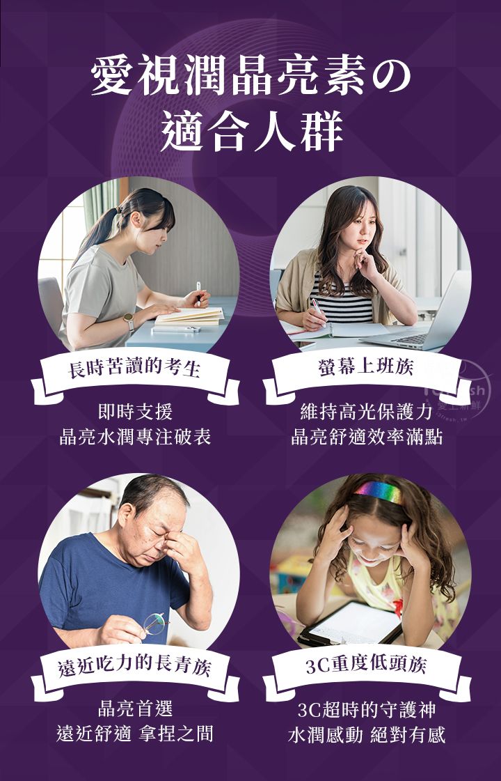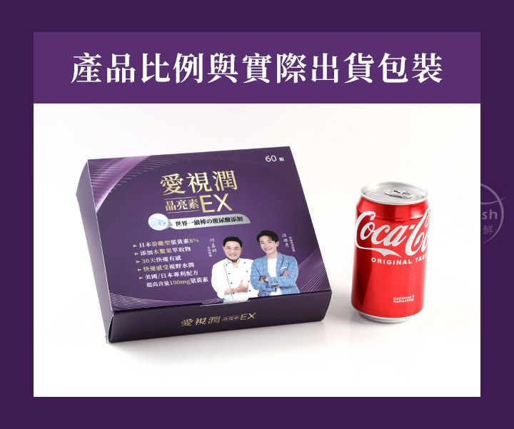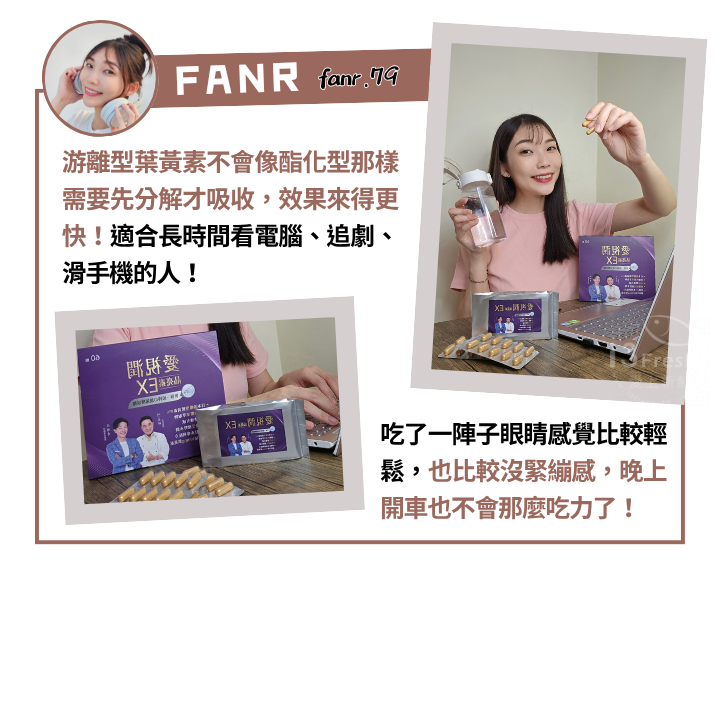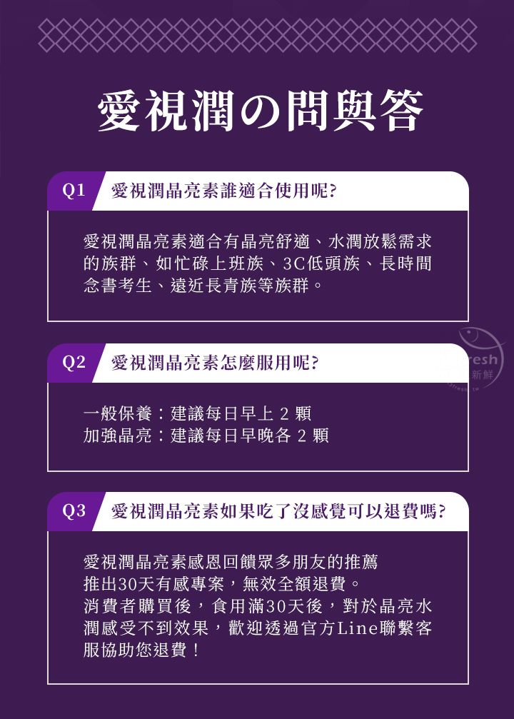 產品成分:木鱉果萃取粉(木鱉果萃取物、麥芽糊精)、日本專利金盞花萃取粉(糊精、金盞花萃取物(含葉黃素)、抗壞血酸)、微結晶狀α-纖維素、刺梨原漿凍乾粉(刺梨原漿"麥芽糊精)、流行鏈球菌發酵物(含透明質酸鈉)、金盞花萃取粉(糊精、金盞花萃取物(含消旋玉米黃質素))、決明子萃取粉(決明子萃取物、麥芽糊精)、枸杞萃取粉(枸杞萃取物、麥芽糊精)、葡萄籽萃取物、松樹皮萃取物(松樹皮、麥芽糊精)、黑醋栗萃取粉(黑醋栗萃取物、麥芽糊精)、小米草萃取粉(小米草萃取物、麥芽糊精)、藍莓萃取粉、山桑子萃取粉(含山桑子萃取物、麥芽糊精)。