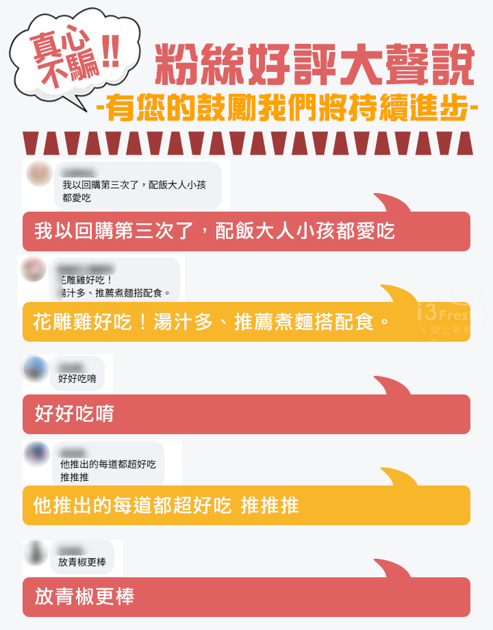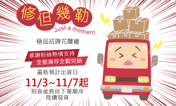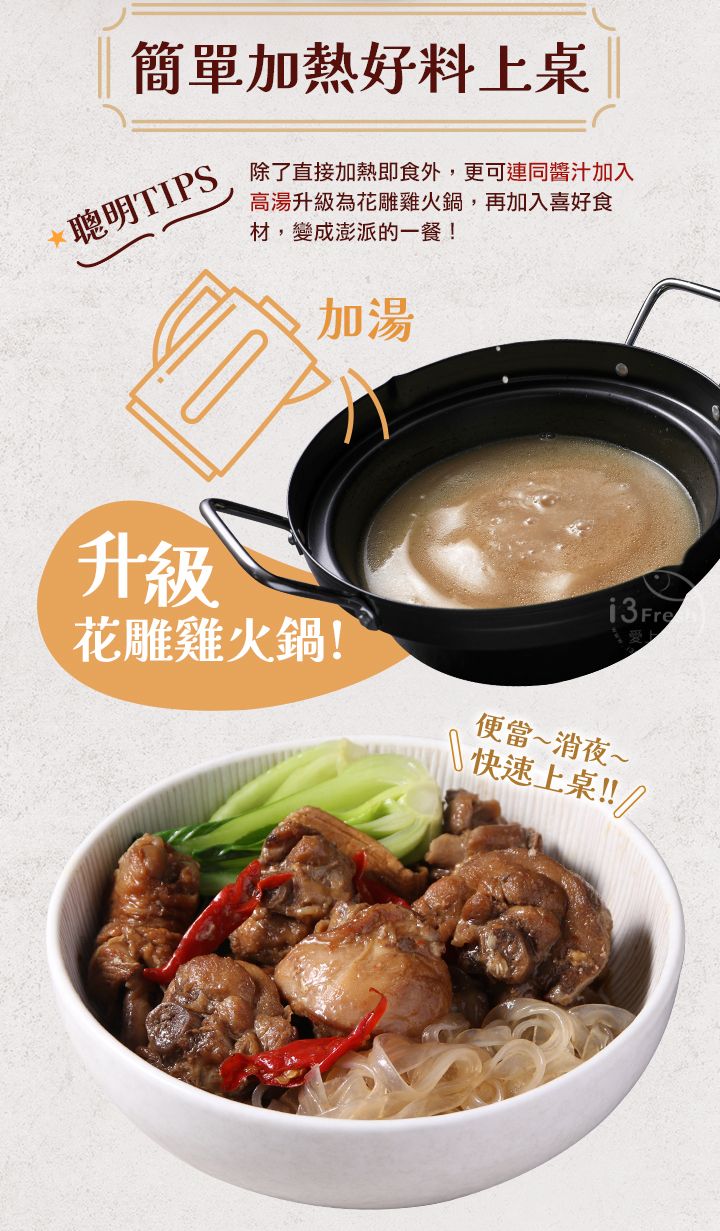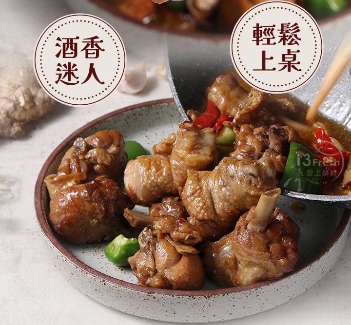 產品成分:雞肉.水.薑.蒜.花雕酒(米.小麥).醬油.香油(大豆沙拉油.芝麻油).料理米酒(米.精製食用酒精).辣椒.醬油膏[水.黑豆.砂糖.食鹽.非基改脫脂黃豆.小麥.糯米.乙醯化己二酸二澱粉.酵母抽出物.調味劑(琥珀酸二鈉).甜味劑(甘草萃)].冰糖.辣豆瓣[黃豆(非基因改造).辣椒.水.鹽.糖.調味劑(DL-胺基丙酸.琥珀酸二鈉.5'-次黃嘌呤核苷磷酸二鈉.5'-鳥嘌呤核苷磷酸二鈉.胺基乙酸).麻油.乳酸].樹薯澱粉.紹興酒(糯米.蓬萊米.小麥).辣椒醬[辣椒.水.鹽.砂糖.麻油.黏稠劑(乙醯化己二酸二澱粉.玉米糖膠).調味劑(L-麩酸鈉.琥珀酸二鈉).甜味劑(醋磺內酯鉀.甘草萃).防腐劑(己二烯酸鉀)1.0g/Kg以下.品質改良劑(偏磷酸鈉).著色劑(食用紅色七.四十號)].黑豆蔭豆豉(黑豆.砂糖.食鹽.大豆沙拉油.醬油).粘稠劑(乙醯化己二酸二澱粉).豆腐乳[非基因改造黃豆.水.糙米.砂糖.鹽.檸檬酸.硫酸鈣.食用酒精.辣椒.品質改良劑-豆腐用消泡劑(完全氫化棕梠油脂.卵磷脂.脂肪酸山梨醇酐酯.二氧化矽)].蒜粉[蒜粉.品質改良劑(二氧化矽)].鹽.糖.調味料(麥芽糊精.食鹽.蔗糖.酵母抽出物.黃豆水解蛋白.香菇抽出物.高麗菜抽出物).白胡椒粉。