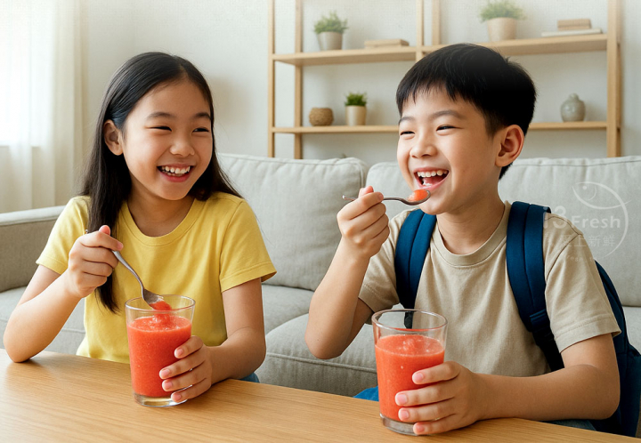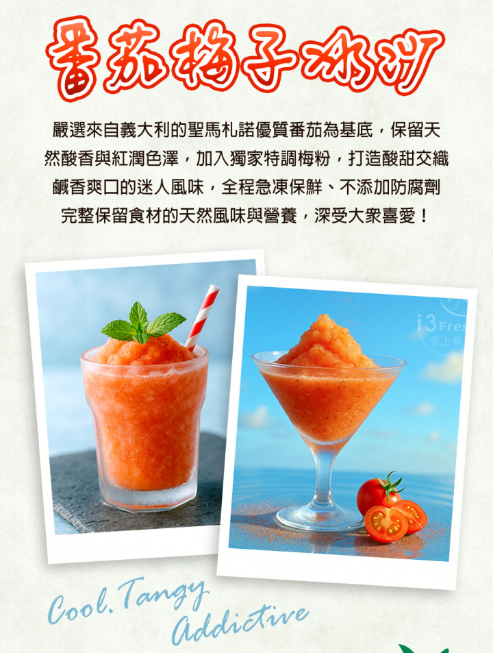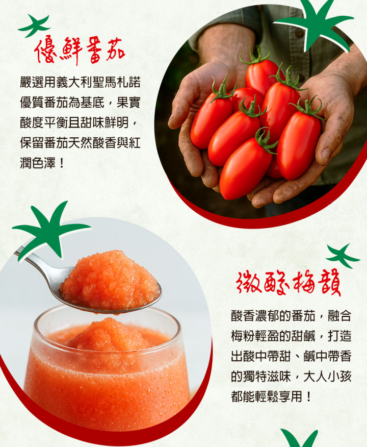 商品成份:水、番茄、蔗糖、梅粉(梅子、砂糖、鹽、甘草、甜味劑(醋磺內酯鉀)、食用紅色6號 (著色劑))、玉米粉、蒟蒻粉(蒟蒻粉、海藻膠、葡萄糖)、檸檬酸 (調味劑)、玉米糖膠(黏稠劑)