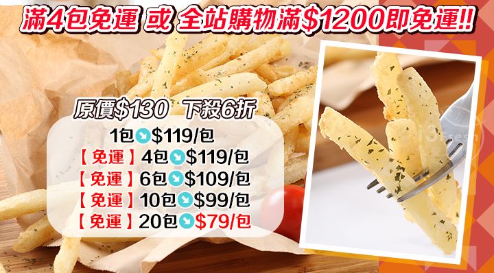 食用方式:需加熱調理使得供食之冷凍食品類。商品無需解凍,油鍋溫度180°C,油炸2~2.5分鐘