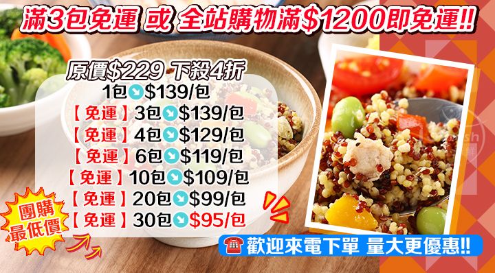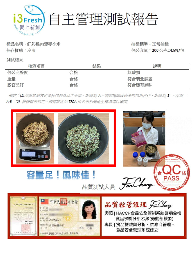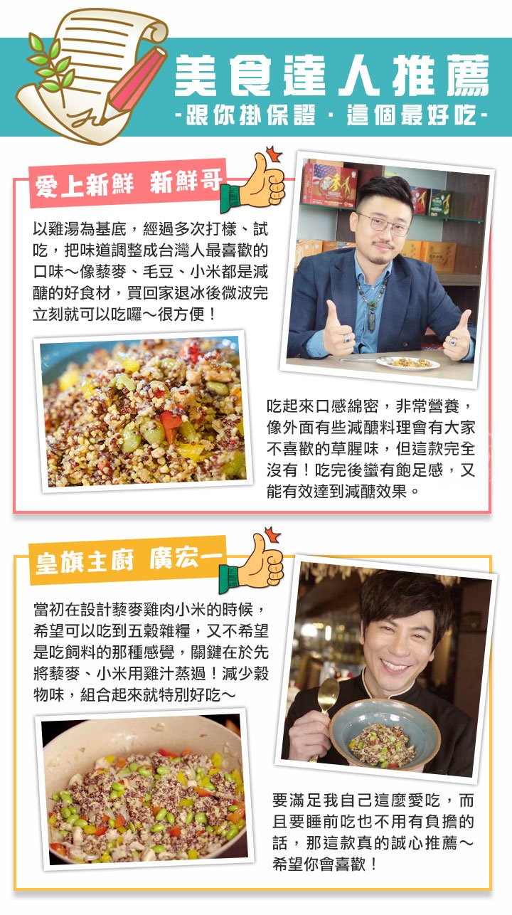 產品成份:水、小米、藜麥、毛豆仁、雞肉、大豆油、洋蔥、甜紅椒、甜黃椒、乙醯化己二酸二澱粉、鹽、糖、黑胡椒