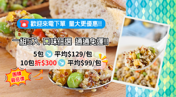 產品成份:毛豆、藜麥、洋蔥、橄欖油、紅椒、黃椒、糖、鹽、黑胡椒粒