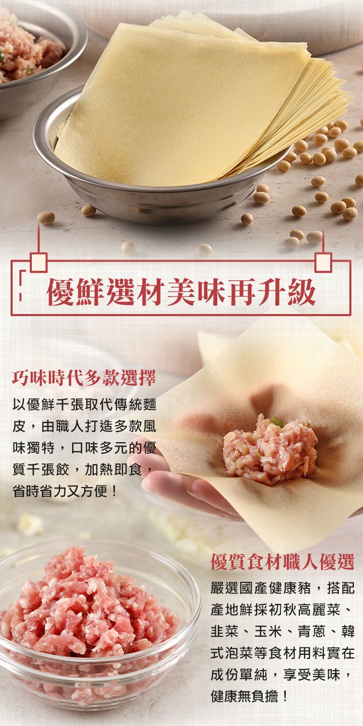 商品成分:豬前腿肉(台灣豬肉)、韓式泡菜(大白菜、辣椒粉、蒜頭、鹽、蘋果、水糖、辣椒、L-麩酸鈉、玉米糖漿、薑、水梨、海藻、糖、魚露(玉筋魚、鹽))、高麗菜、青蔥、千張(非基改黃豆、消泡劑(矽樹脂、脂肪酸山梨醇酐酯、聚山梨醇酐脂肪酸酯六十五、羧甲基纖維素鈉、水))、薑、醬油、香油(大豆沙拉油、芝麻油)、米酒、雞粉(鹽、麥芽糊精、L-麩酸鈉、糖、玉米澱粉、雞肉粉、香料、酵母萃取物(酵母萃取物、鹽)、雞油、棕櫚油(棕櫚油、硬質棕櫚油)、調味劑(5'-次黃嘌呤核苷磷酸二鈉、5'-鳥嘌呤核苷磷酸二鈉)、白胡椒))、海鹽、糖、白胡椒