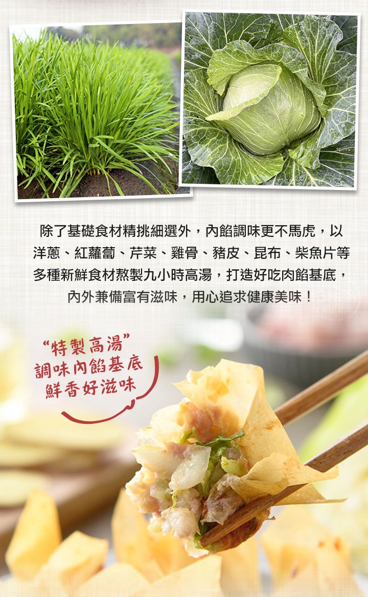 商品成分:豬前腿肉(台灣)、韭菜、高湯(水、洋蔥、紅蘿蔔、芹菜、雞骨、豬皮(台灣)、昆布、柴魚片)、千張(非基改黃豆、消泡劑(矽樹脂、脂肪酸山梨醇酐酯、聚山梨醇酐脂肪酸酯六十五、羧甲基纖維素鈉、水))、薑末、醬油、香油(大豆沙拉油、芝麻油)、米酒、雞粉(鹽、麥芽糊精、L-麩酸鈉、糖、玉米澱粉、雞肉粉、香料、酵母萃取物(酵母萃取物、鹽)、雞油、棕櫚油(棕櫚油、硬質棕櫚油)、調味劑(5'-次黃嘌呤核苷磷酸二鈉、5'-鳥嘌呤核苷磷酸二鈉)、白胡椒)、海鹽、糖、白胡椒