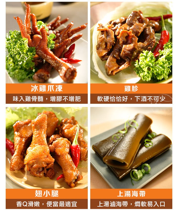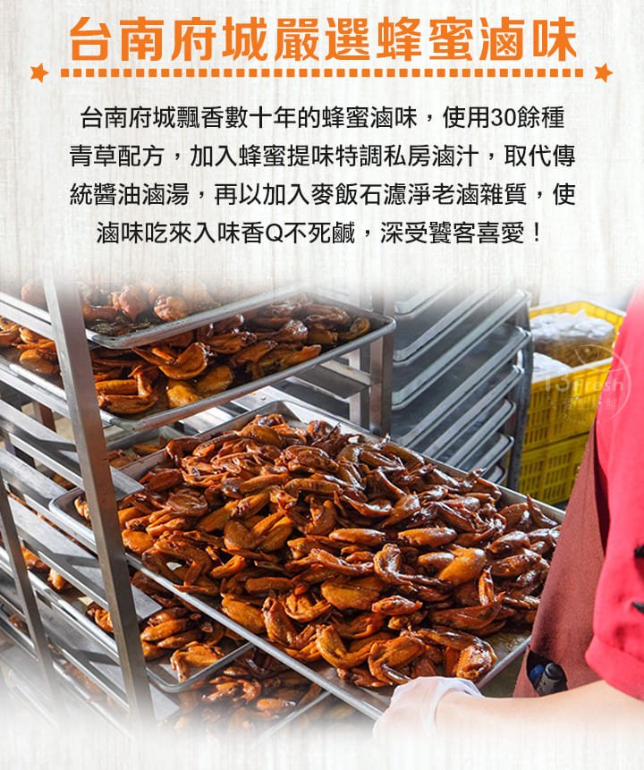 產品成份:雞爪、飲用水、滷汁【冰糖、香料(大本九層塔、甘草、大茴香、小茴香、羅漢果)、鹽、高鮮味精〔L-麩酸鈉、核苷酸(5'-次黃嘌呤核苷磷酸二鈉、5'-鳥嘌呤核苷磷酸二鈉)、羧甲基纖維素鈉〕、糖、辣椒粉、蜂蜜】