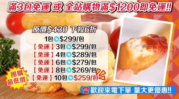 產品成份:雞肉(組合)、雞皮、裹漿粉[麵粉、玉米澱粉(非基改)、胡椒、大豆油、水解大豆蛋白(非基改)、酸性焦磷酸鈉、碳酸氫鈉、L-麩酸鈉]、精製軟棕油、大豆蛋白(非基改)、鹽、味精、馬鈴薯澱粉、玉米澱粉(非基改)、多磷酸鈉、焦磷酸鈉、偏磷酸鉀、小麥蛋白、胺基乙酸、DL-胺基丙酸、糖、琥珀酸二鈉、5'-鳥嘌呤核苷磷酸二鈉、5'-次黃嘌呤核苷磷酸二鈉、麥芽糊精、雞油、香料、酵素製劑(甘油、麥芽糖醇、谷氨酰胺轉氨酶)