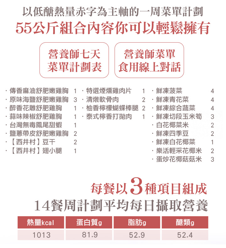 商品重量:超嫩蒜味辣椒舒肥雞胸170公克±10%、傳香麻油舒肥嫩雞胸170公克±10%、四川輕麻辣舒肥嫩雞胸170公克±10%、養生藥膳舒肥嫩雞胸170公克±10%、超嫩油蔥舒肥嫩雞胸180公克±10%、原味海鹽舒肥嫩雞胸170公克±10%、清燉軟骨肉300公克(固型物重量140公克)、川味椒香雞腿塊300±5% /包、招牌香菇湯500g±10%(固形物:175g)、鮮凍四季豆200±10%、綜合蔬菜200±10%、菠菜200±10%、青花菜200±10%、白花椰菜200±10%、玉米筍200g±10%、鮮凍白花椰菜米250公克±10%(含盒重)、樂活輕采花椰米200公克±4.5%、三杯杏鮑菇200g±10%/包、秘製老滷藥膳雞胗180g±5%、日式蒲燒鯛魚腹排150公克±3%/包、泰式檸香打拋肉200公克±4.5%、西井村豆干115公克、台灣無毒鳳尾甜蝦100g±10%(20±3隻/盒)、日式鹽蔥帶皮舒肥嫩雞胸180公克±10%、柚香檸檬蝴蝶棒腿200g、煙熏雞肉片170g±10%、萬巒煙燻豬耳絲120g