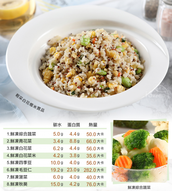 2. 鮮凍白花椰菜:白花椰菜 [營養標示:每包含-熱量56g/蛋白質4.4g/脂訪0.6g(飽和脂肪0.2g)/碳水化合物6.2g/糖5.2g/鈉8mg]