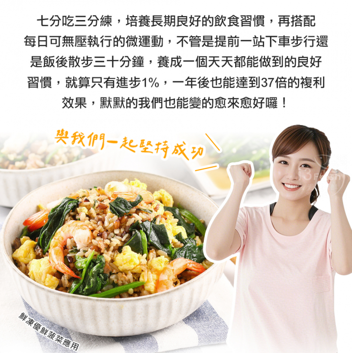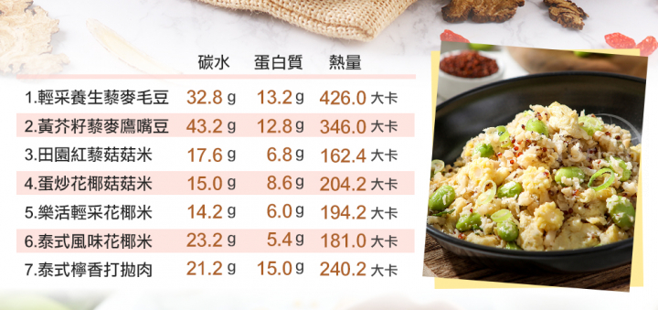 成分:花椰菜米、蛋、杏鮑菇、毛豆(非基因改造)、非基因改造玉米筍、大豆油、紅藜麥、水、青蔥、醬油、香油(芝麻油、大豆油)、雞粉[鹽、麥芽糊精、L-麩酸鈉、糖、玉米澱粉、雞肉粉、香料、酵母萃取粉(酵母萃取物、鹽)、雞油、棕櫚油、調味劑(5’-次黃嘌呤核苷磷酸二鈉、5’-鳥嘌呤核苷磷酸二鈉)、白胡椒]、糖、黑胡椒粒、鹽