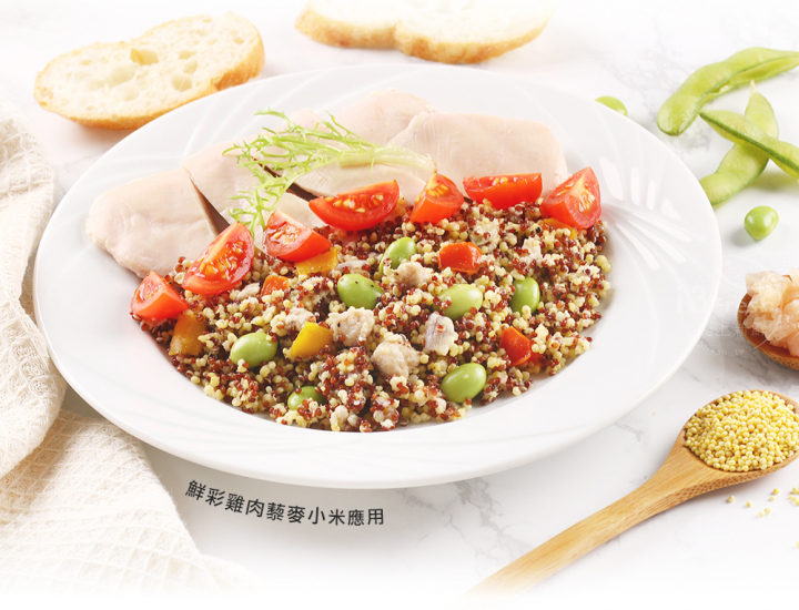 產品成份:水、小米、藜麥、毛豆仁、雞肉、大豆油、洋蔥、甜紅椒、甜黃椒、乙醯化己二酸二澱粉、鹽、糖、黑胡椒