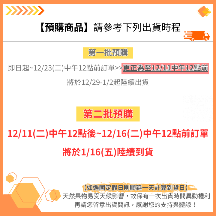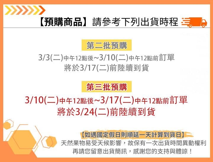 3. 訂單款項須於販售時間內完成付款,若未完成付款之訂單,將安排於下次出貨,造成不便敬請原諒。