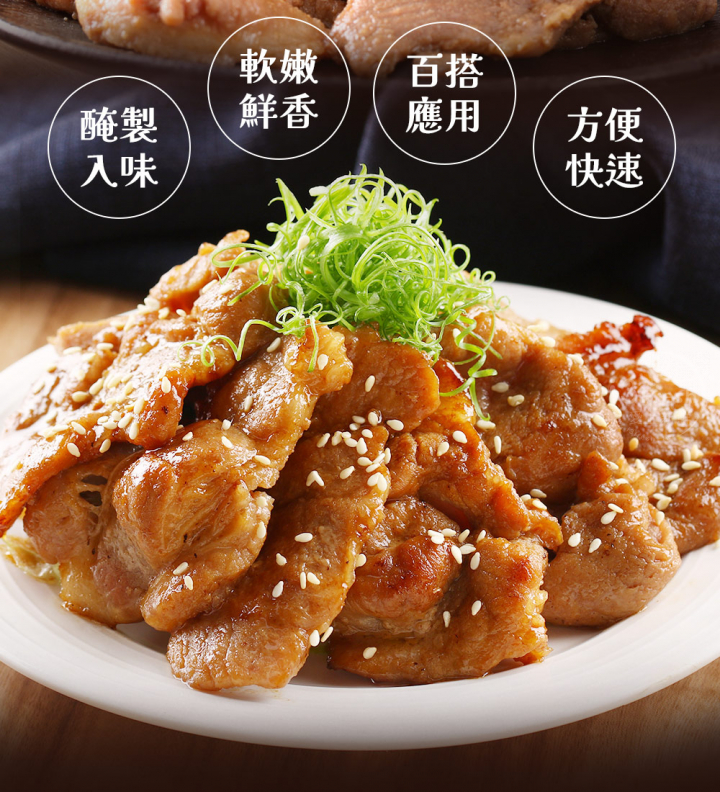 商品成分:豬肉、水、糖、鹽、醬油、味醂 [果糖、水、糯米、米麴、釀造糯米醋、 鹽、調味劑(胺基乙酸、DL-胺基丙酸、 檸檬酸)]、酵母、麥芽糊精、鹿角菜膠、 纖維素、葡甘露聚醣、碳酸氫鈉、碳酸鉀、檸檬酸鈉、麩醯胺轉胺酶、白胡椒粉、蒜頭、米酒、多磷酸鈉、L-麩酸鈉