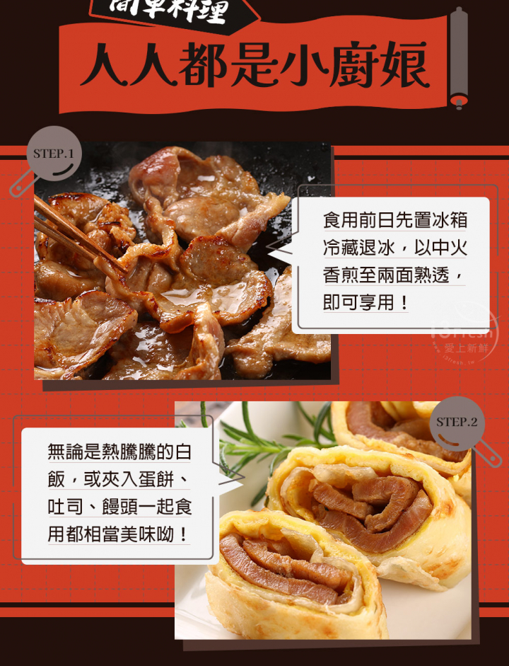 加熱調理條件(油煎):先退冰後,將肉品放入平底鍋用中小火約5-6分鐘,煎至全熟後,即可食用。