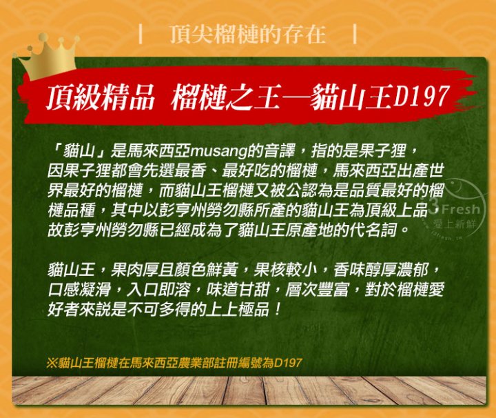 產品成分:水、調和乳(水、牛奶、乳粉、無水奶油、乳清粉)、貓山王榴果肉、糖、椰子油、麵粉