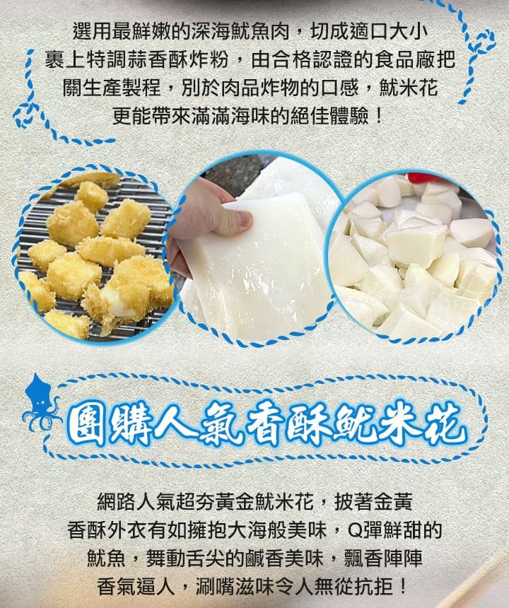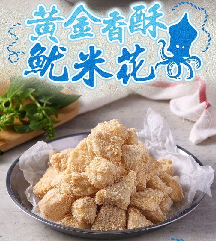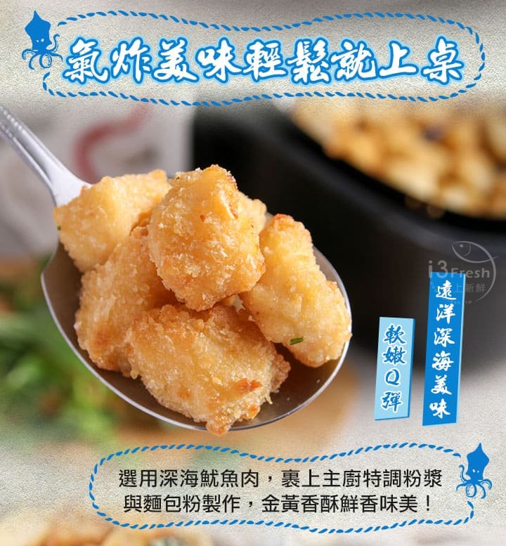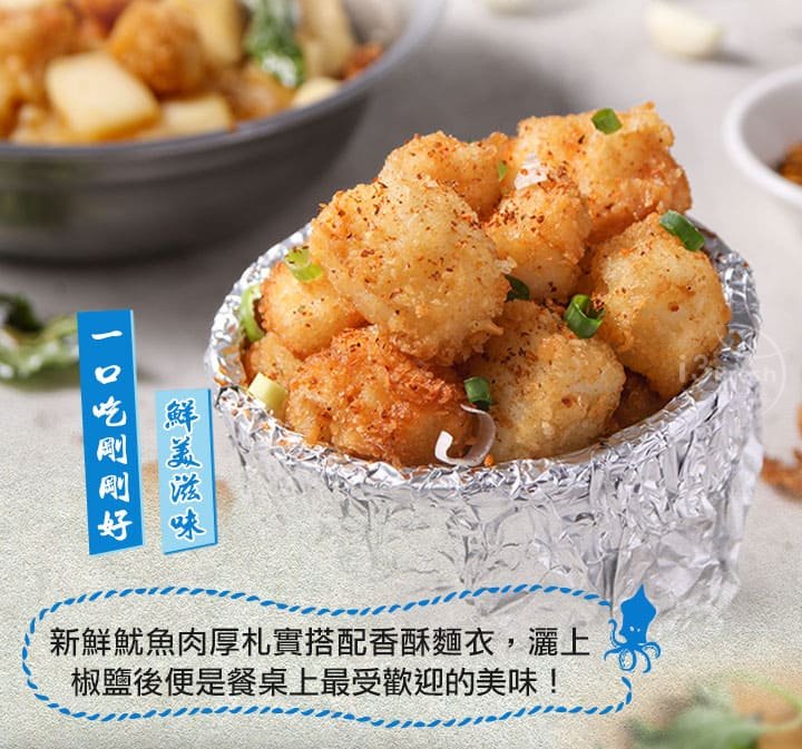商品成分:魷魚、糖、鹽、耐炸油【精純棕櫚油、L-抗壞血酸(抗氧化劑)、丙二醇、矽樹脂(消泡劑)】、大豆蛋白、白色麵包粉【麵粉(小麥、L-抗壞血酸(抗氧化劑))、水、精製棕櫚油(棕櫚油、香料、混合濃縮生育醇(抗氧化劑))、鹽、黃豆粉、酵母、玉米澱粉、硫酸鈣、碳酸氫銨製劑(碳酸氫銨、碳酸鎂)、L-抗壞血酸(抗氧化劑)、酵母抽出物、L-半胱胺酸鹽酸鹽、精製椰子油】、中筋麵粉、低筋麵粉、地瓜粉、玉米澱粉、保良久(多磷酸鈉、焦磷酸鈉(無水))、益美蘭(乾酪素鈉、麥芽糊精、醋酸澱粉、關華豆膠、辛烯基丁二酸鈉澱粉)、甘立寧(麥芽糊精、甘草萃(甜味劑)、檸檬酸鈉、二氧化矽) 、蒜頭粉、胡椒粉、長壽酥發粉(碳酸氫鈉、樹薯澱粉、反丁烯二酸、磷酸二氫鈣、燒鉀明礬、鉀明礬)、美力精粉(L-麩酸鈉、琥珀酸二鈉、DL-胺基丙酸、5’-次黃嘌呤核苷磷酸二鈉、5’-鳥嘌呤核苷磷酸二鈉)